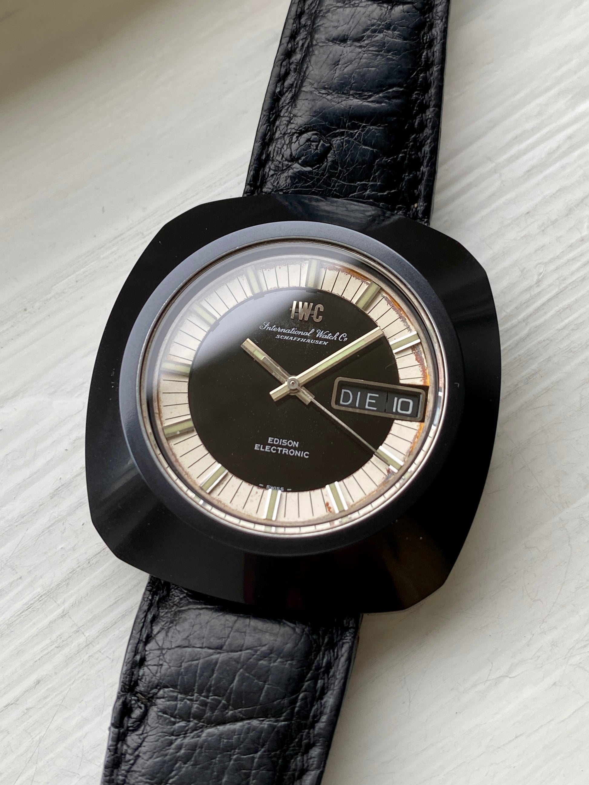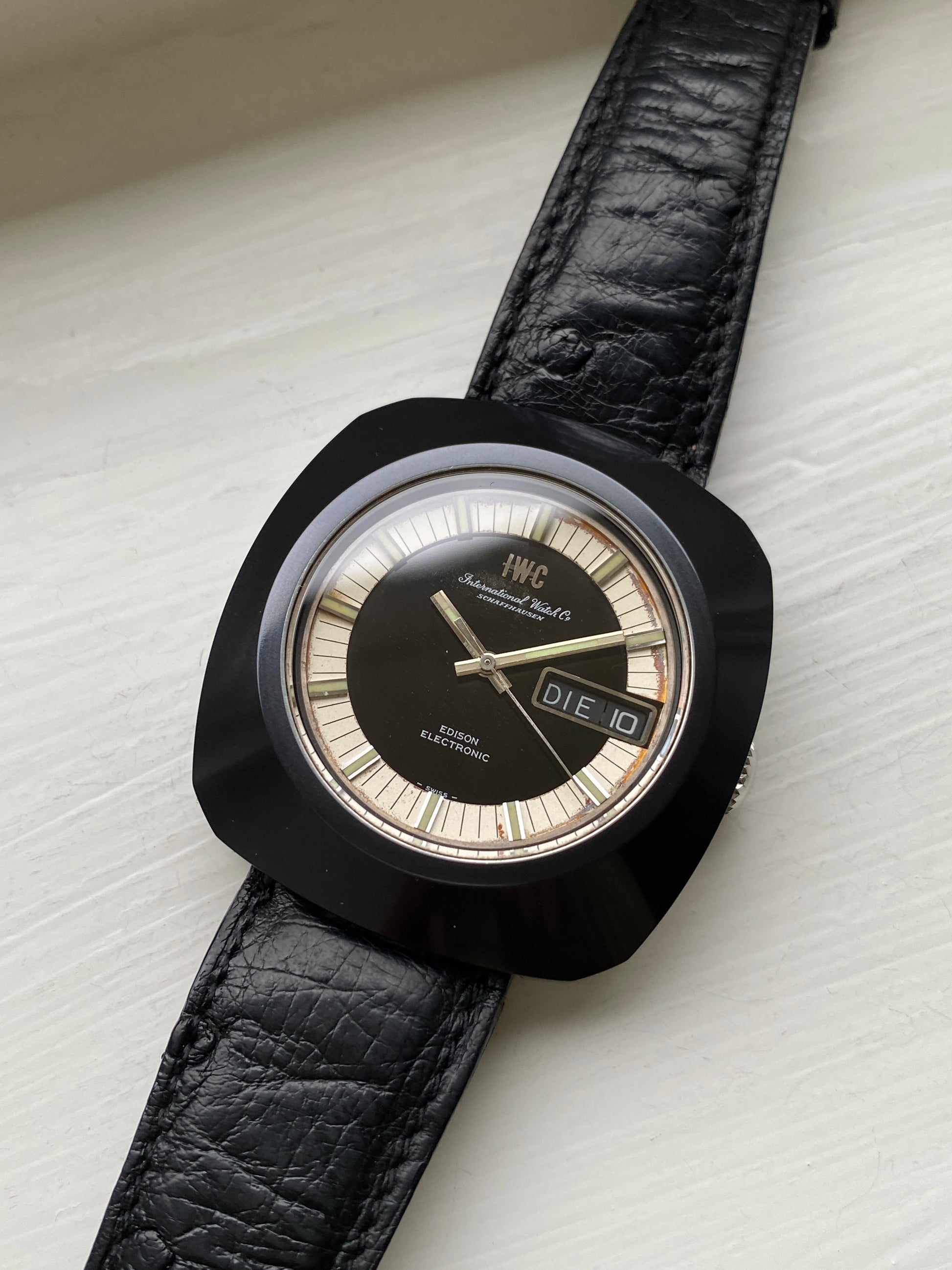 A very special piece, this IWC Edison Electric from 1971 in mint condition. The Edison Electric was produced in silver and black, with the black version being the rarest, with only a limited number made. It houses caliber 160, the robust ESA 9164 tuning-fork movement, and the day can be displayed in German or English.