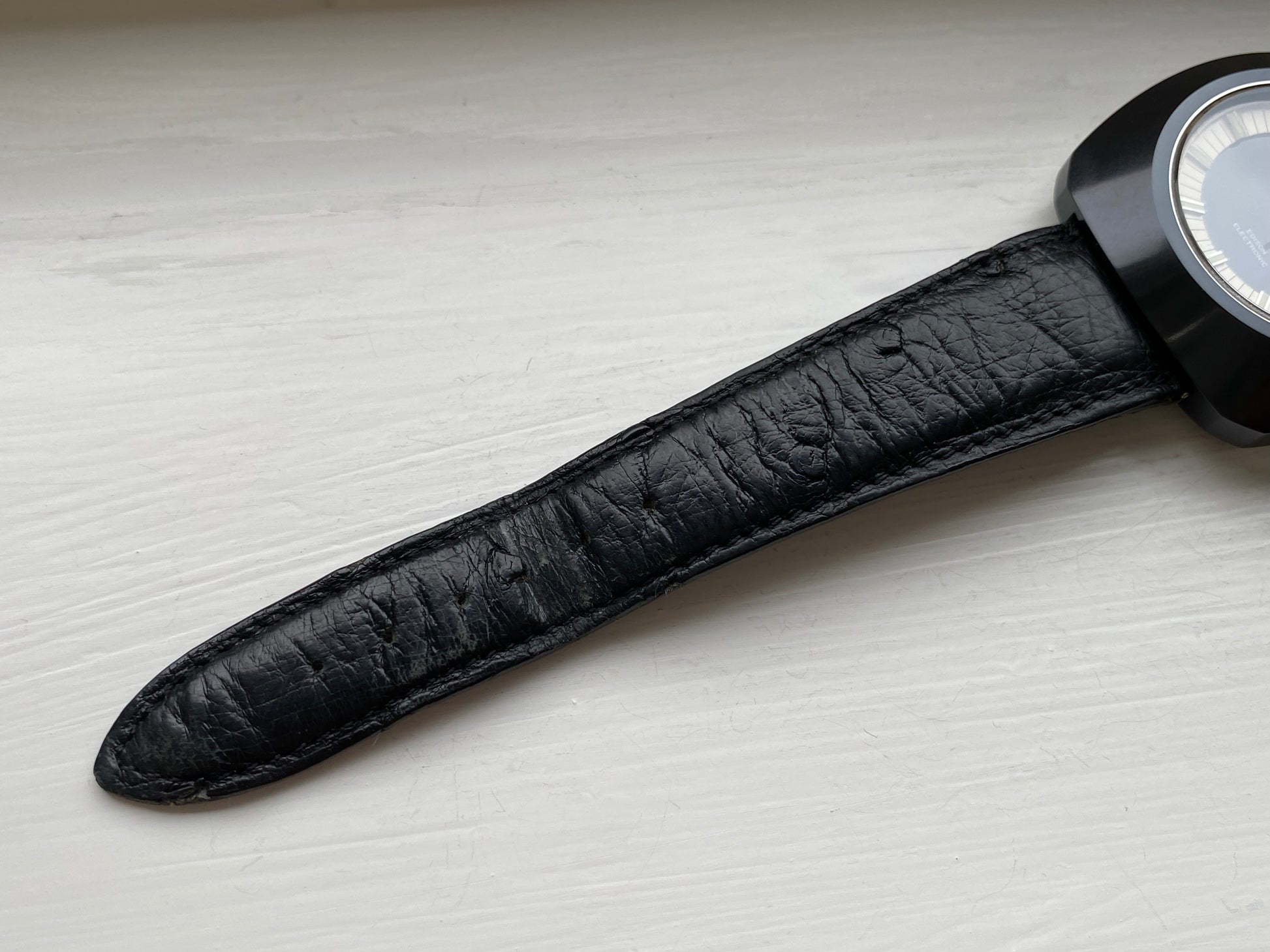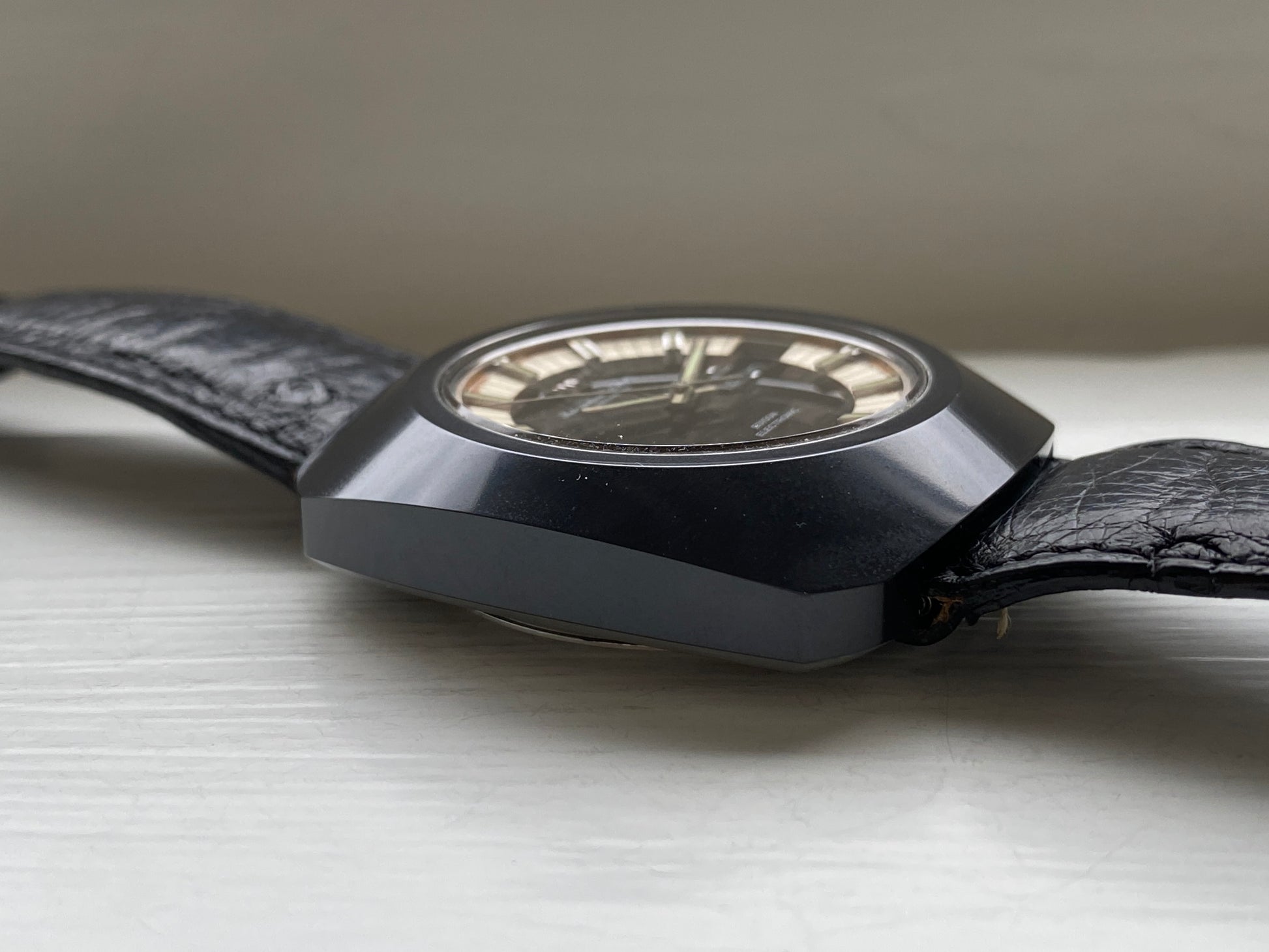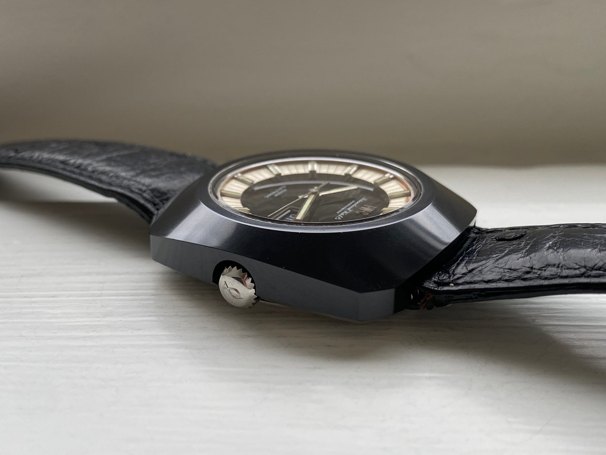 This example is in excellent condition with only minimal signs of wear. The case is made of carbide tungsten and remains pristine. The dial features a subtle orange edge, adding a touch of colour and character to the black and white layout. The movement has been inspected and is untouched, with a recently replaced battery. It runs with an impressive accuracy of just a few seconds per day.
