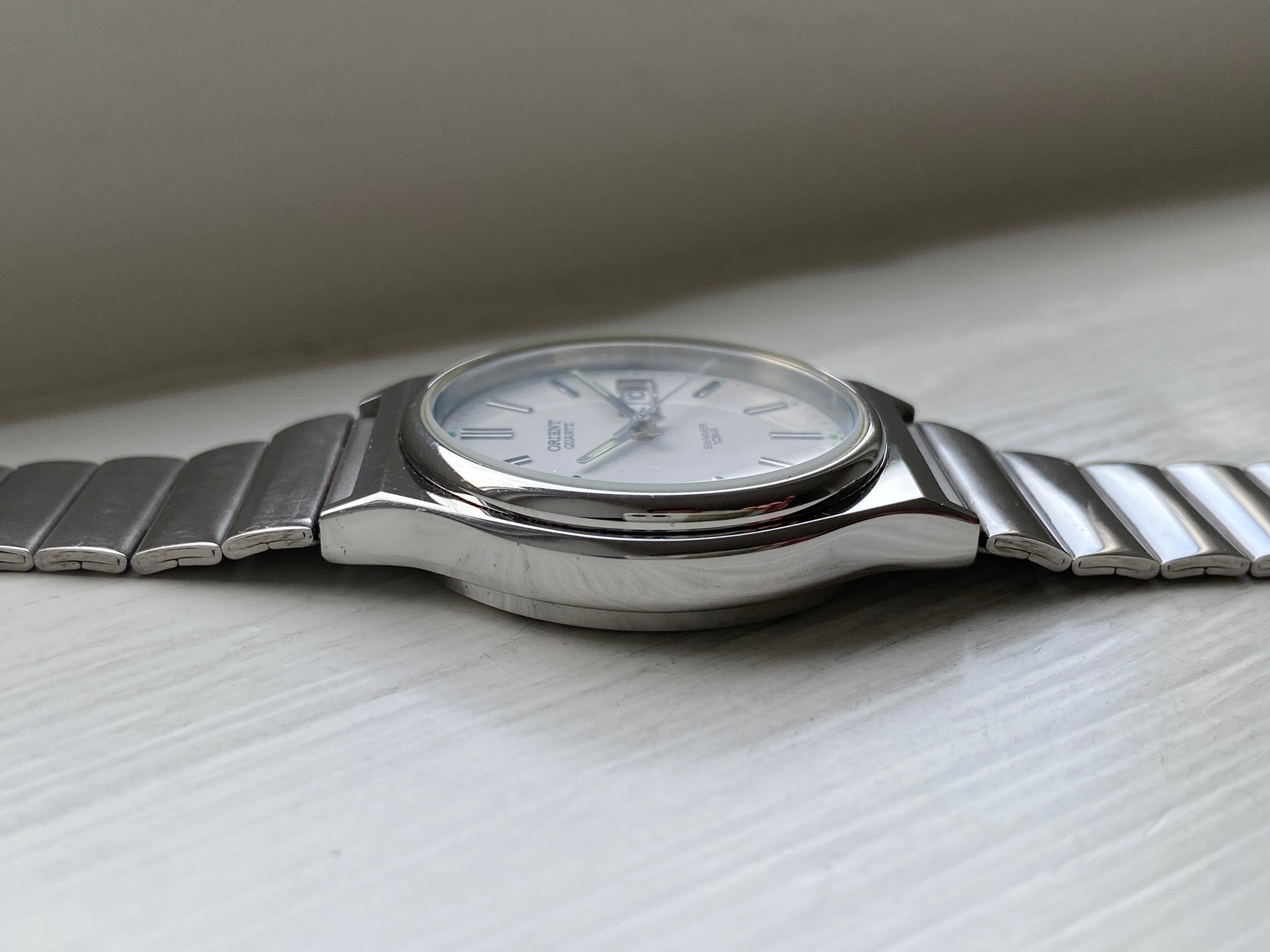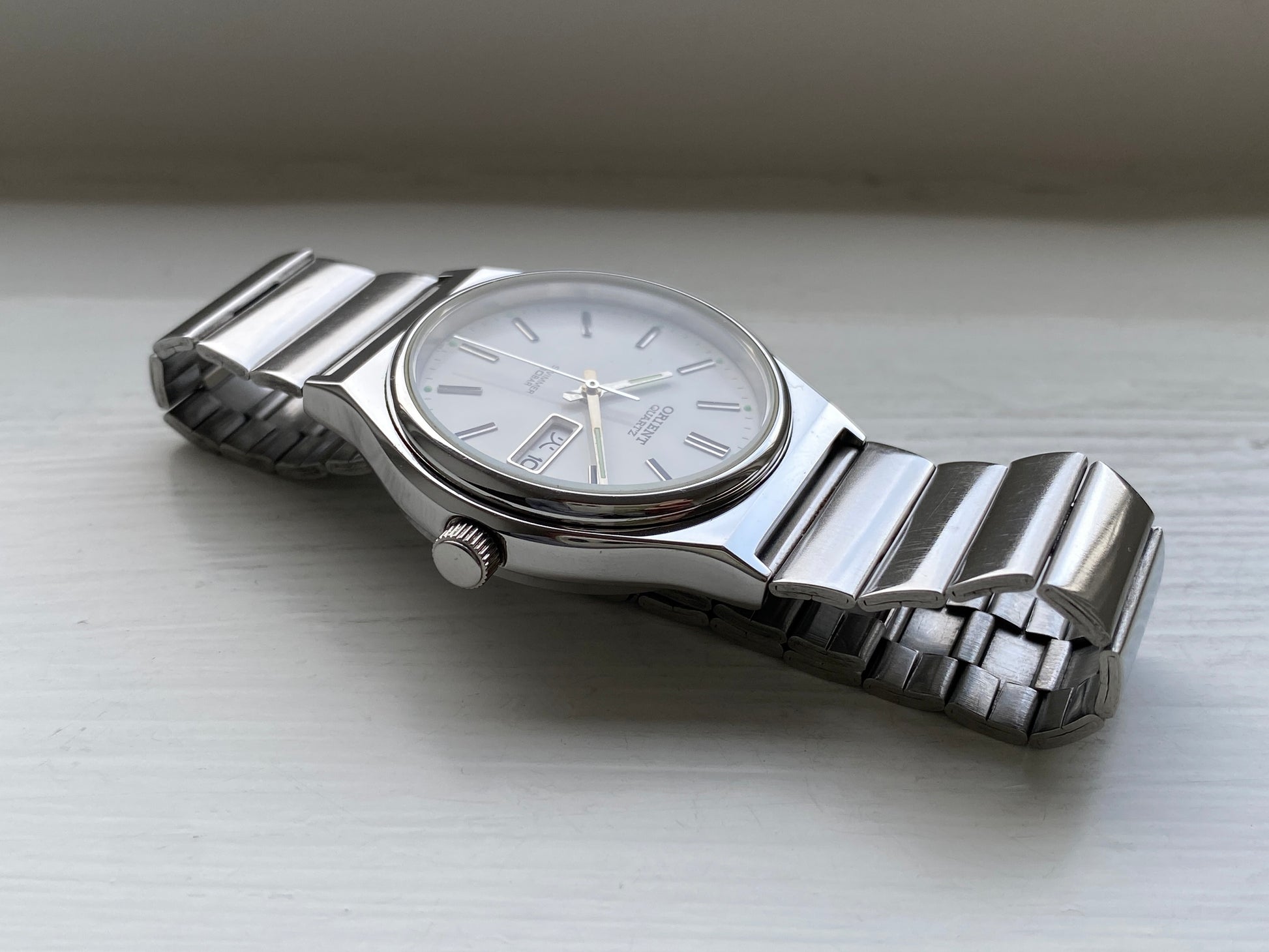 Minimalistic and elegant Orient Swimmer from 1998. Unlike the brushed finishes commonly found on vintage Seiko models, both the case and bracelet feature a high-polished stainless-steel finish. The day can be displayed in Japanese Kanji and English. It has been paired with an aftermarket bracelet that complements the case design and finish very well.