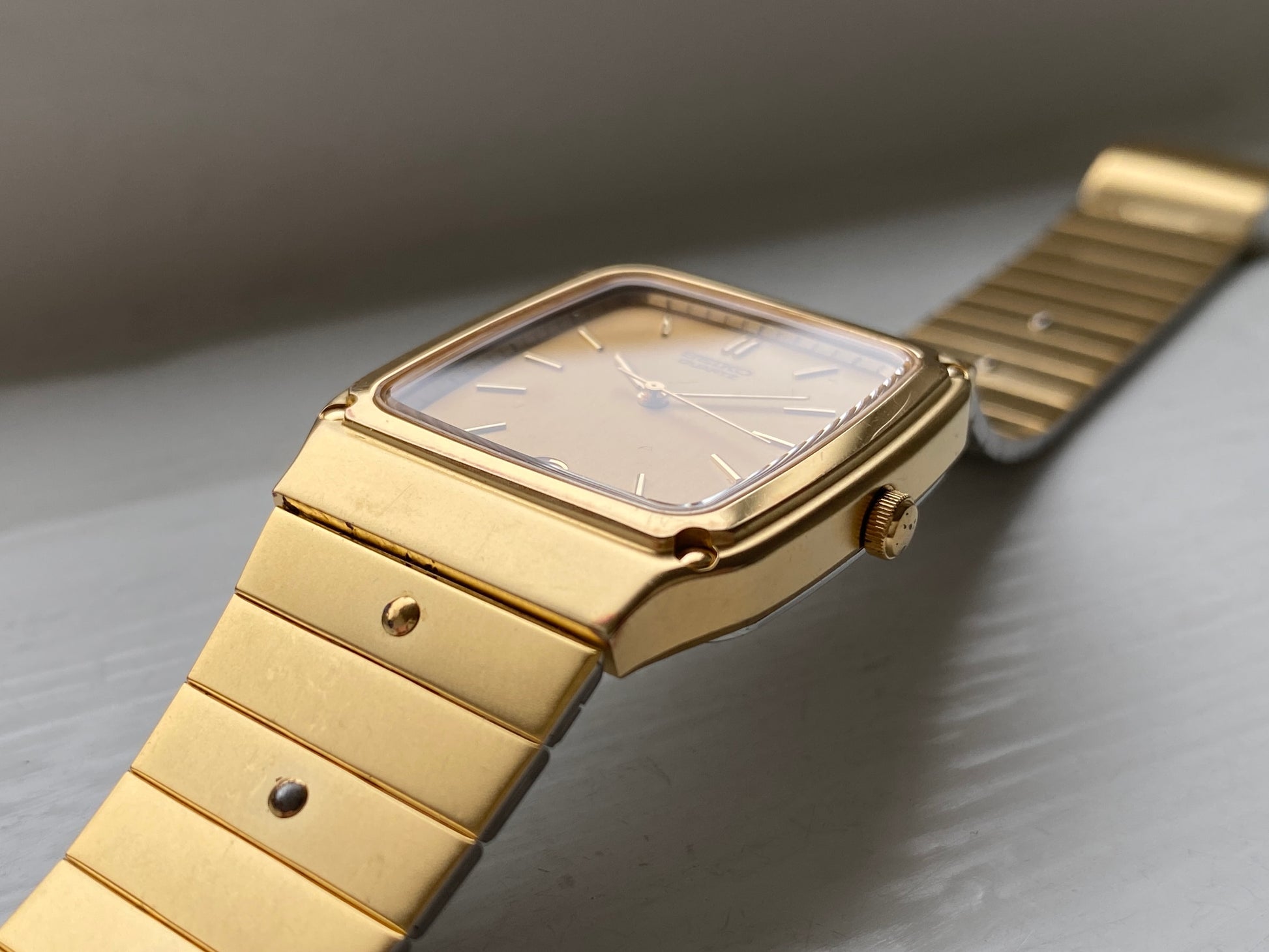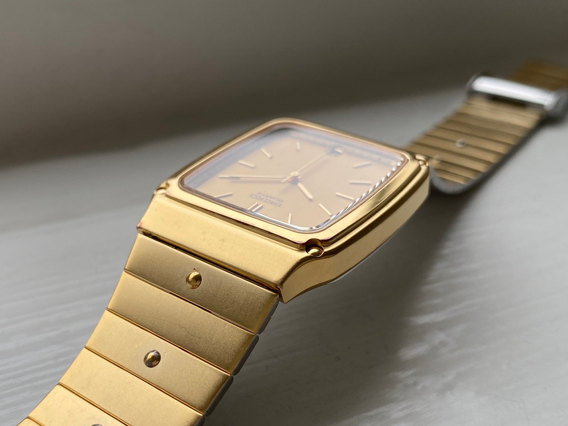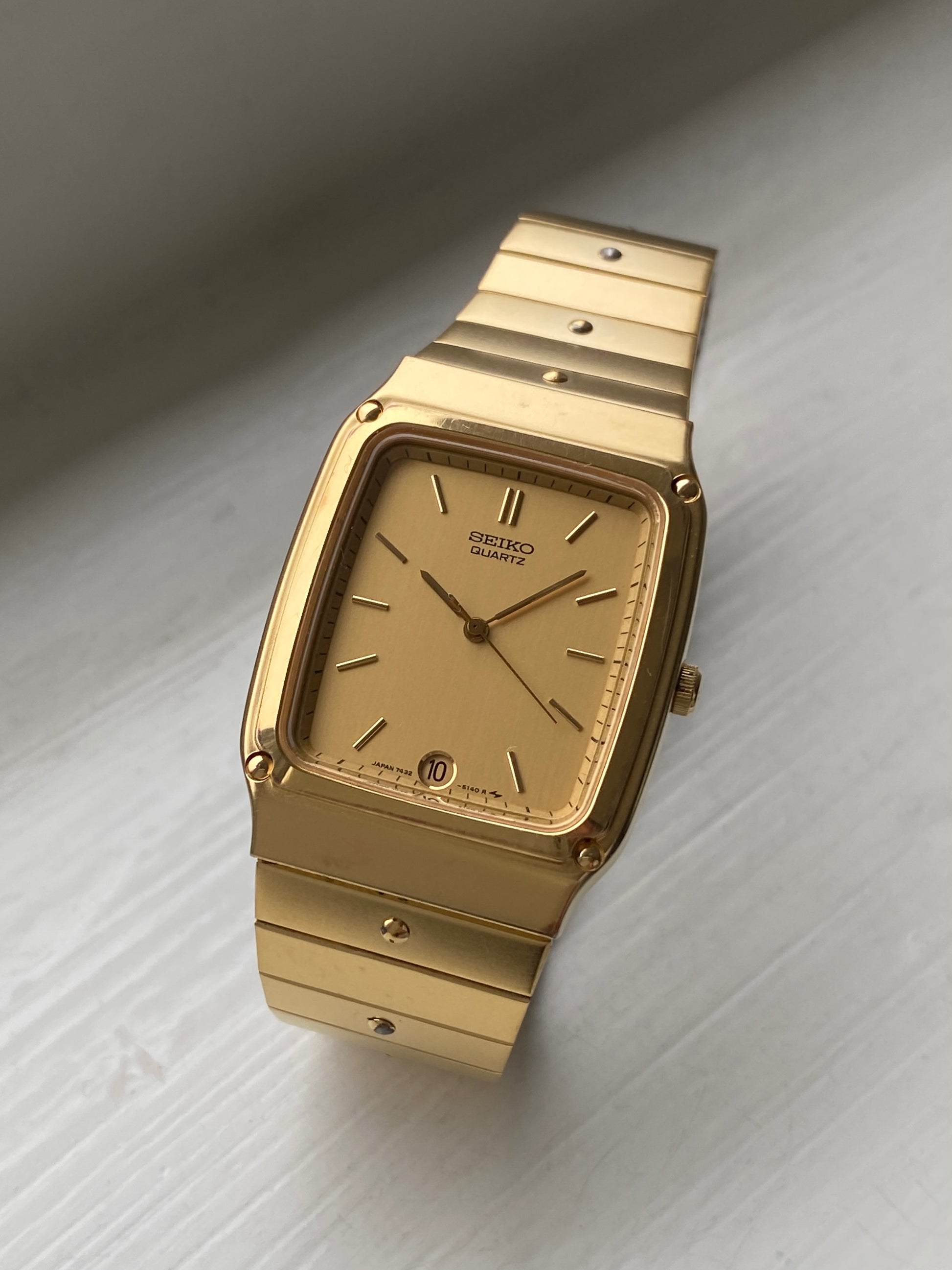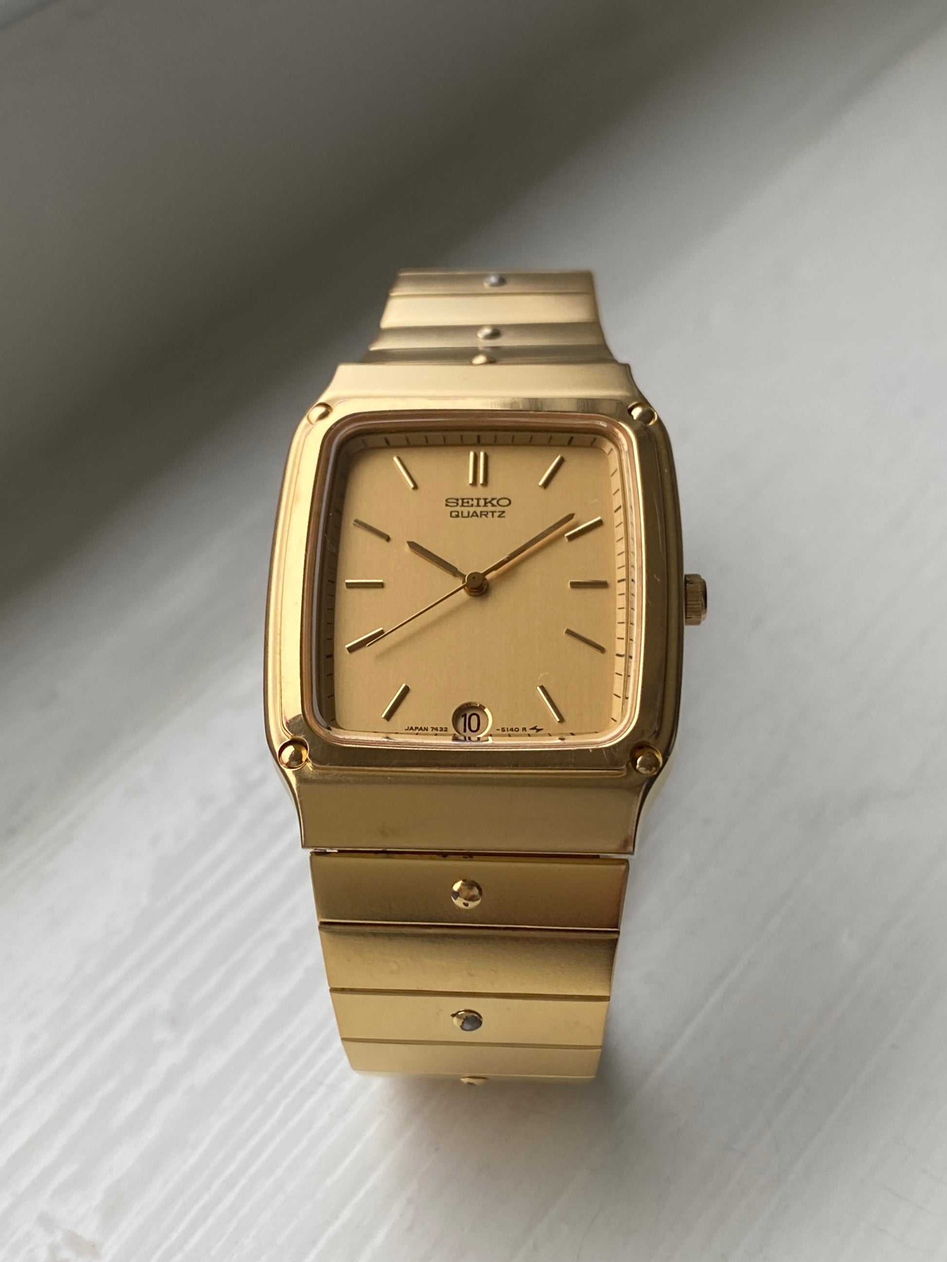 If you’re looking for an all-gold Seiko, this is the one. This rare Seiko quartz from the 80s has minimalistic dial with a classy 6 o’clock date window. The case is 28x37mm, but doesn’t feel small on the wrist. The bracelet can easily be adjusted to fit any wrist size.