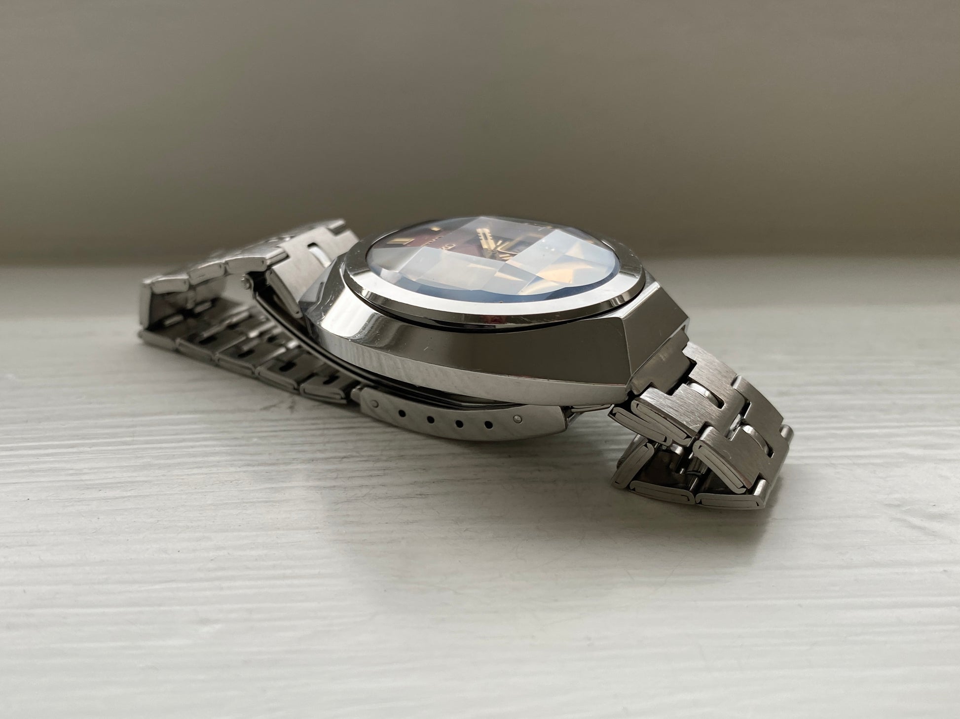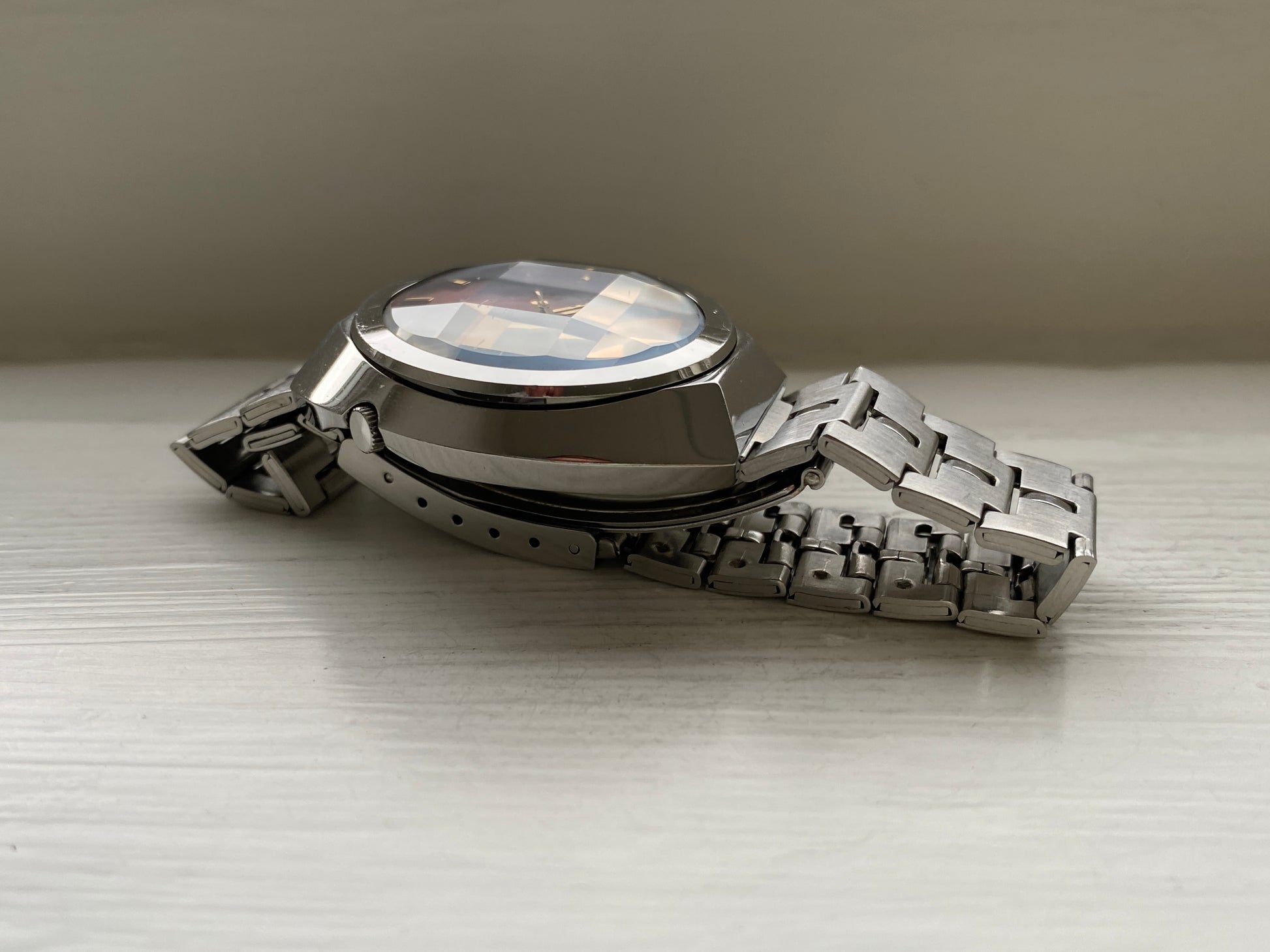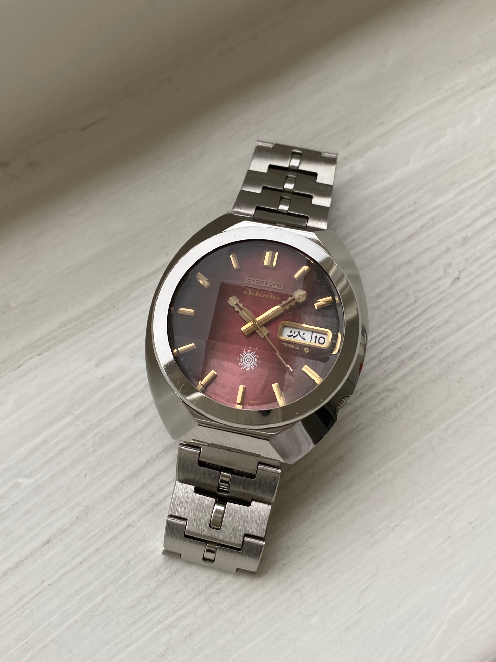 Seiko Advan from 1974 in exceptional mint condition. It features an alluring red textured dial under a faceted crystal. The day can be displayed in Japanese Kanji and English. If you’re looking for something unusual and colourful, this is the watch for you.
