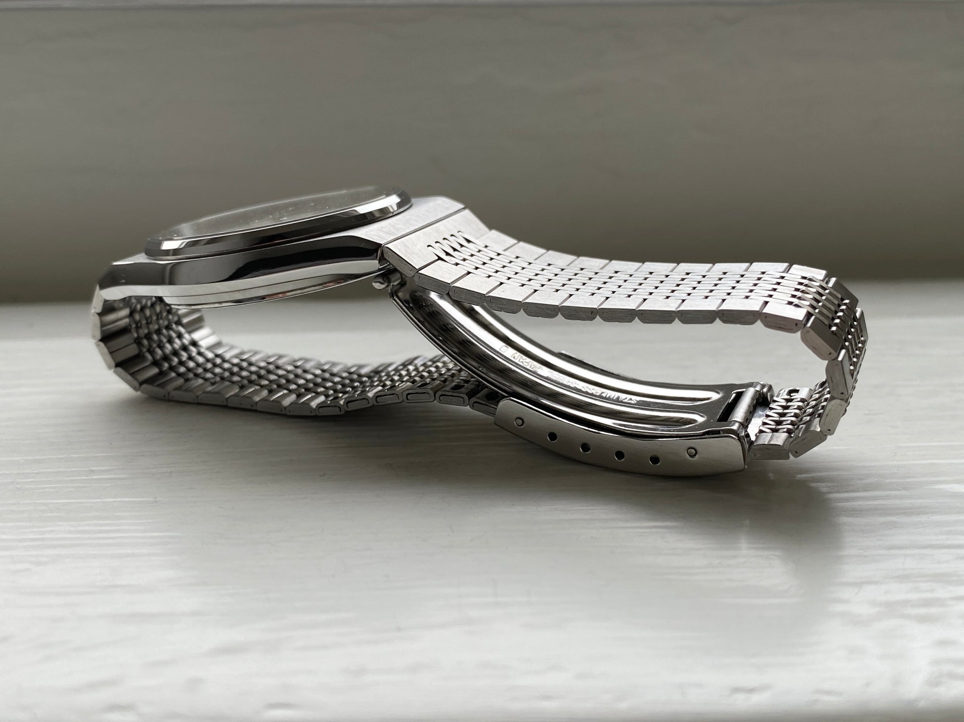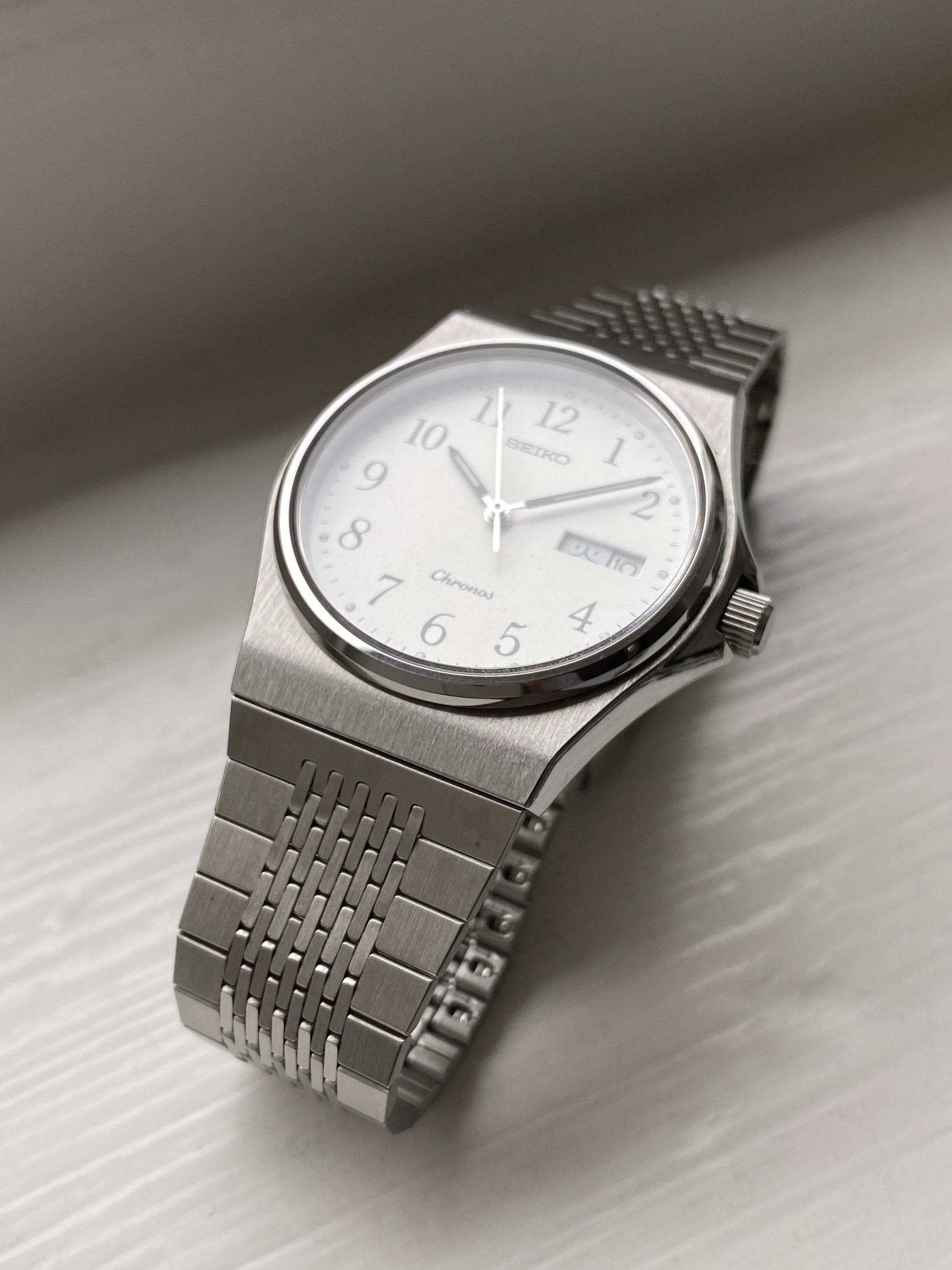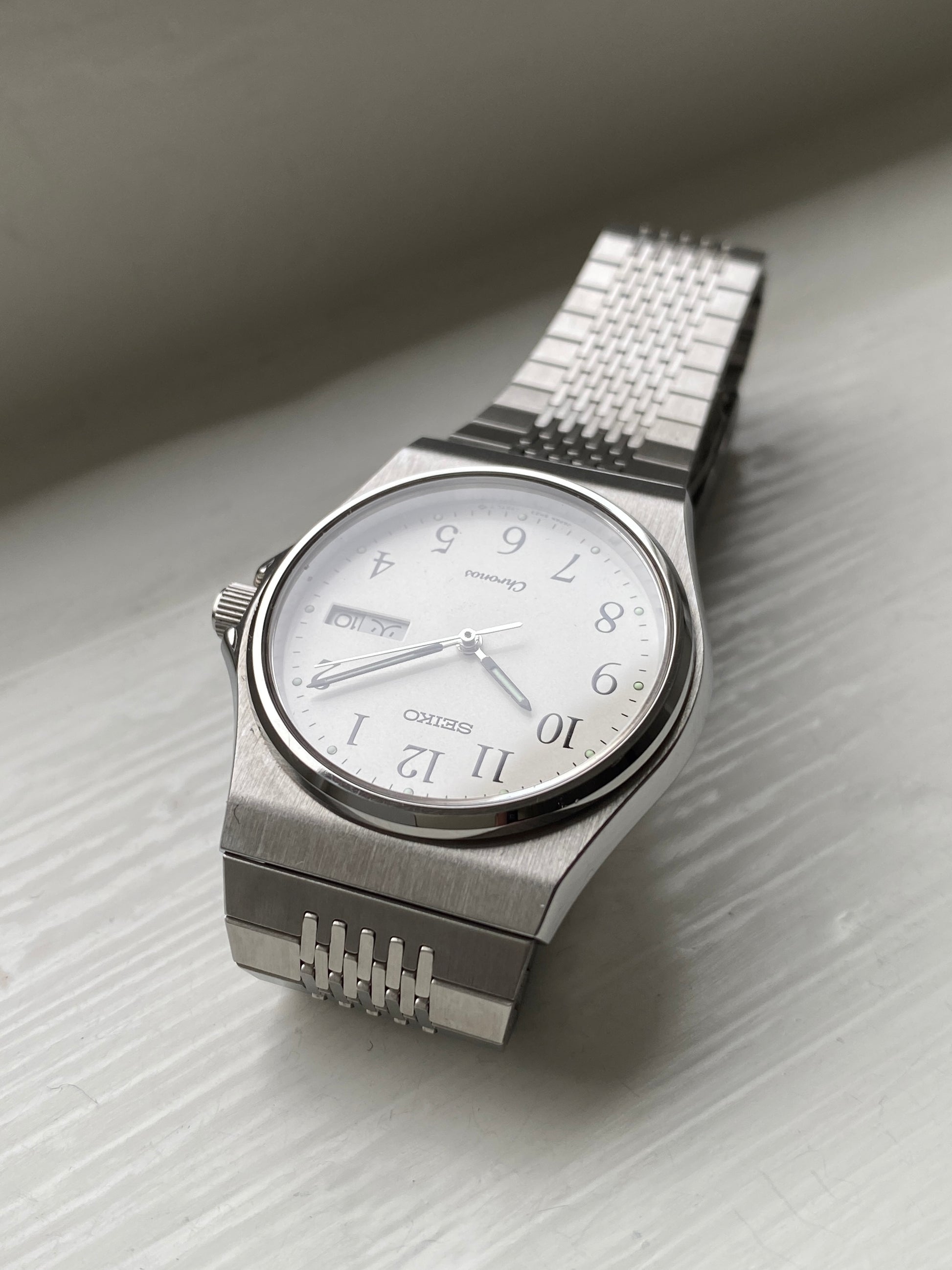 Classy Seiko Chronos from 1989. Made for the Japanese domestic market (JDM). Brushed steel with a classic silver Arabic dial. It features a screw-down crown and a high-quality quartz movement. The day can be displayed in Japanese Kanji and English. Pretty thin, so it slides right under the cuff of your shirt.