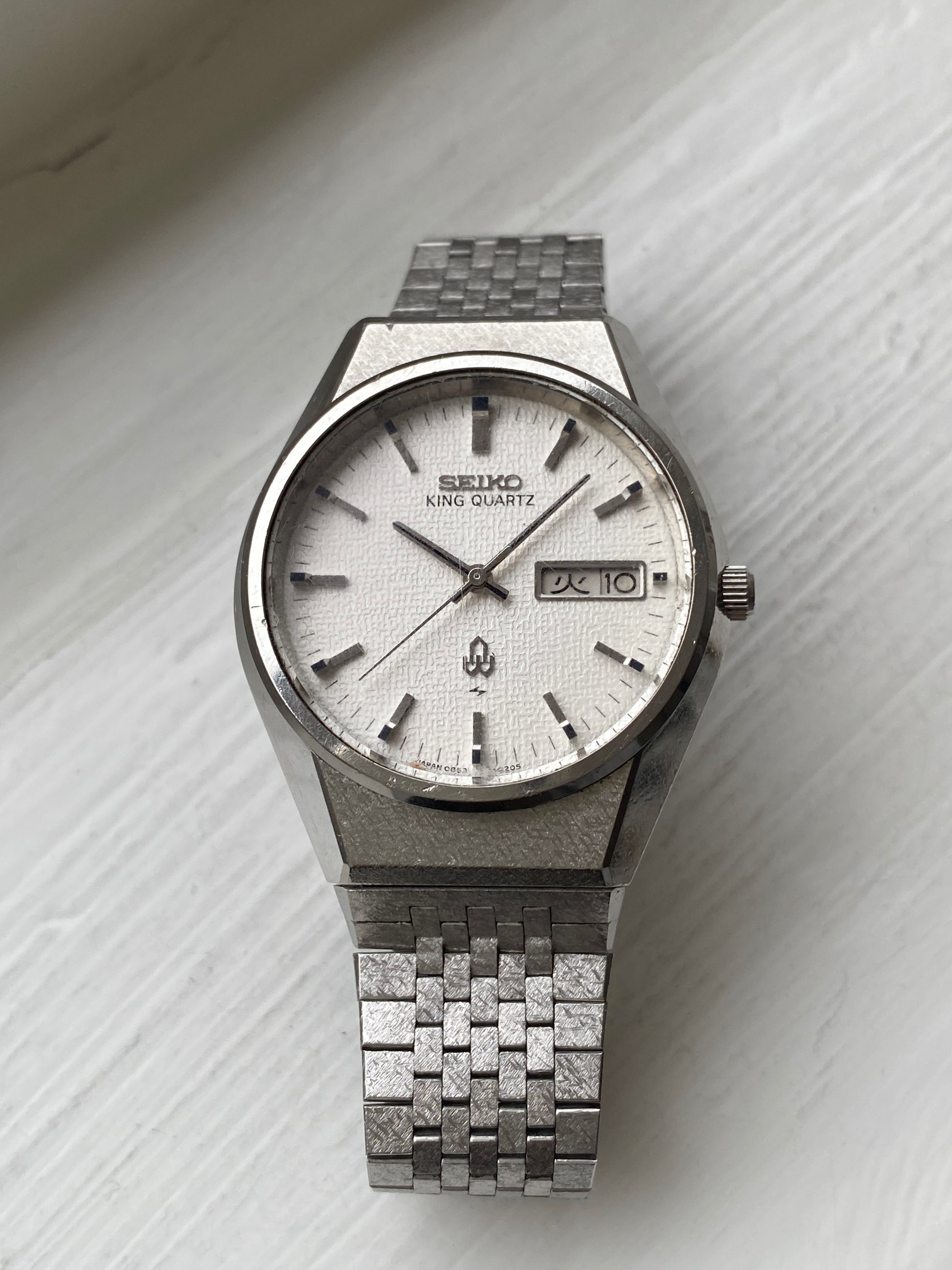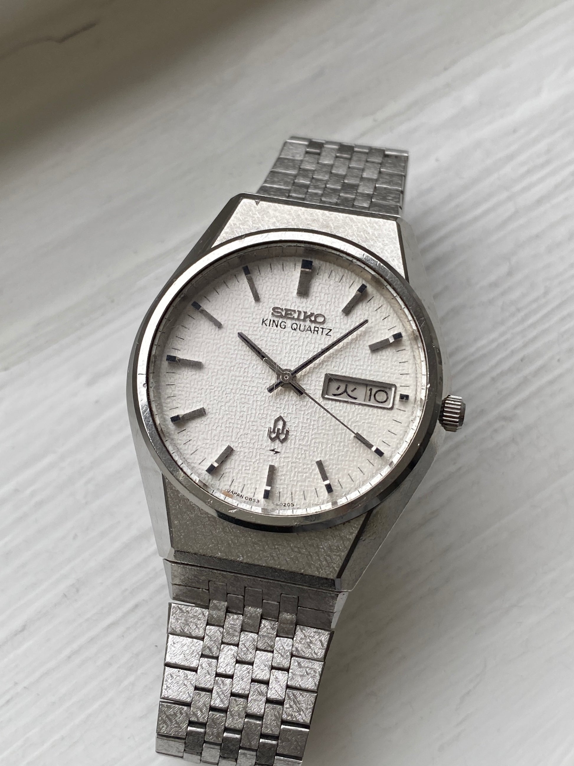 Seiko King Quartz 0853-8025 from 1976. An early King Quartz, since the King Quartz model debuted in 1975. This watch with hammered finish features a crisp white textured dial with a subtle tactile pattern. The L-shaped indices add to the character.