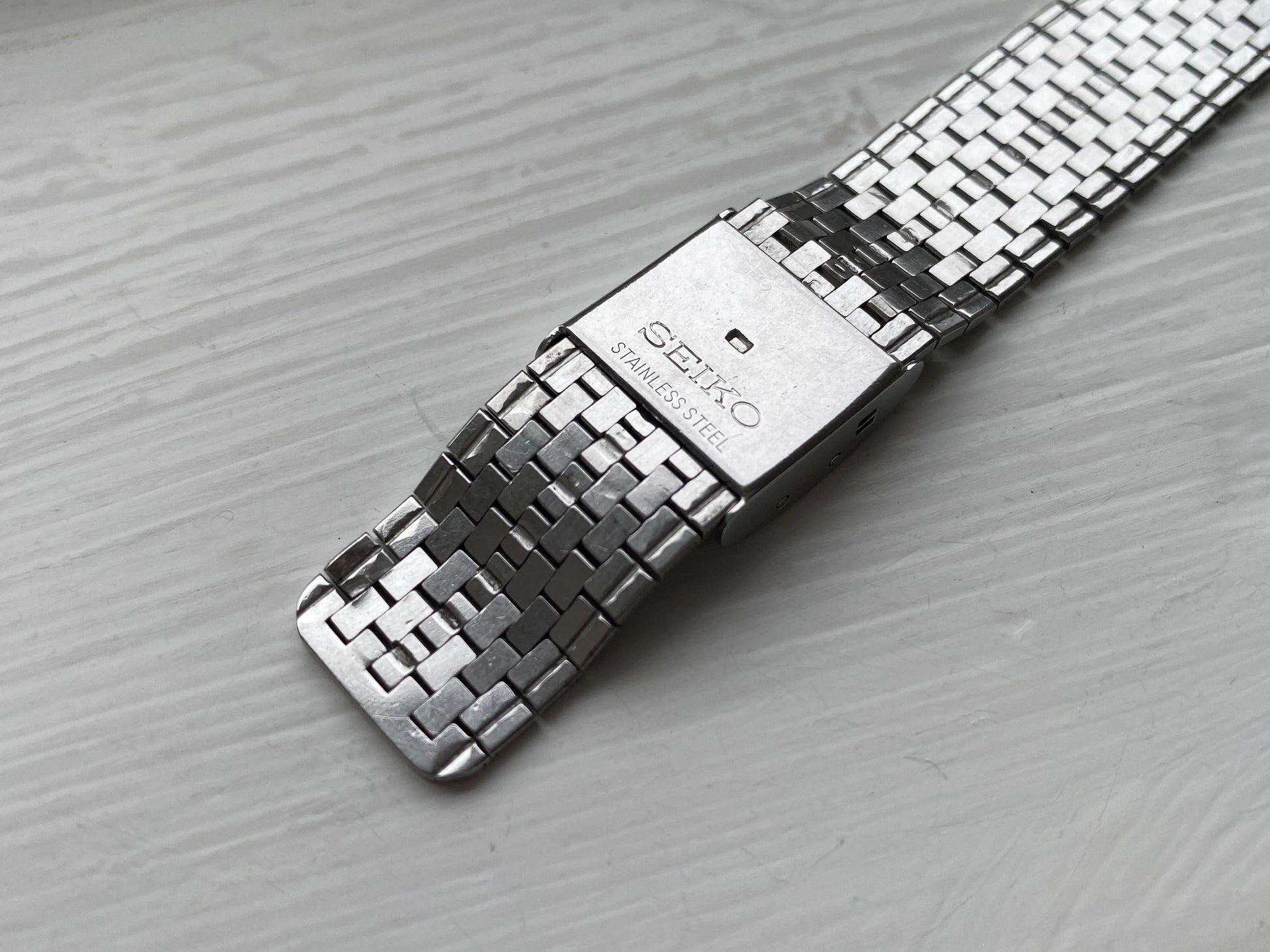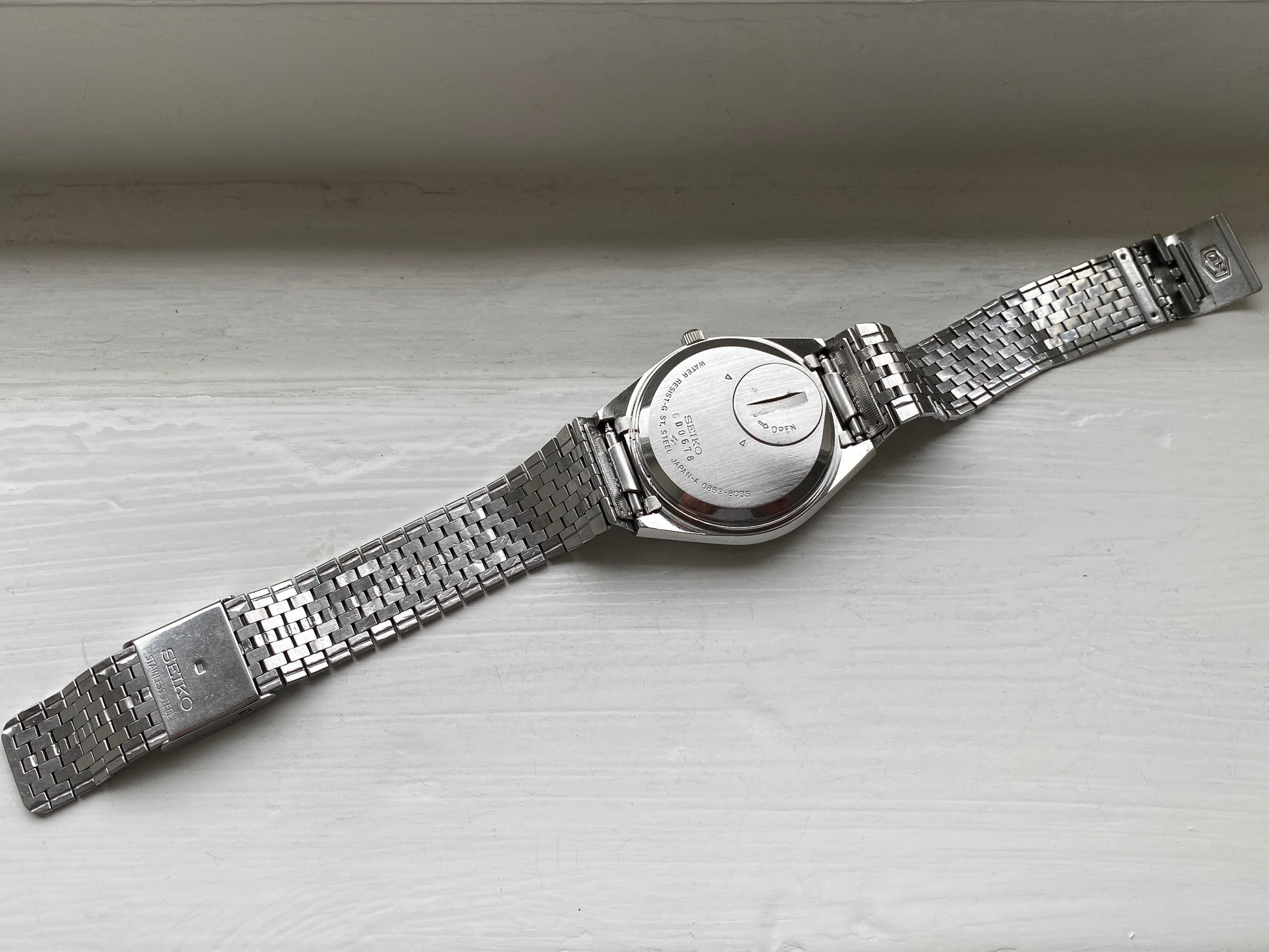 Both the hammered-finish case and the original AR-coated crystal remain in excellent shape. The bracelet is light and loose-fitting and can be easily adjusted to fit most wrist sizes. The day display can be displayed in Japanese Kanji and English.