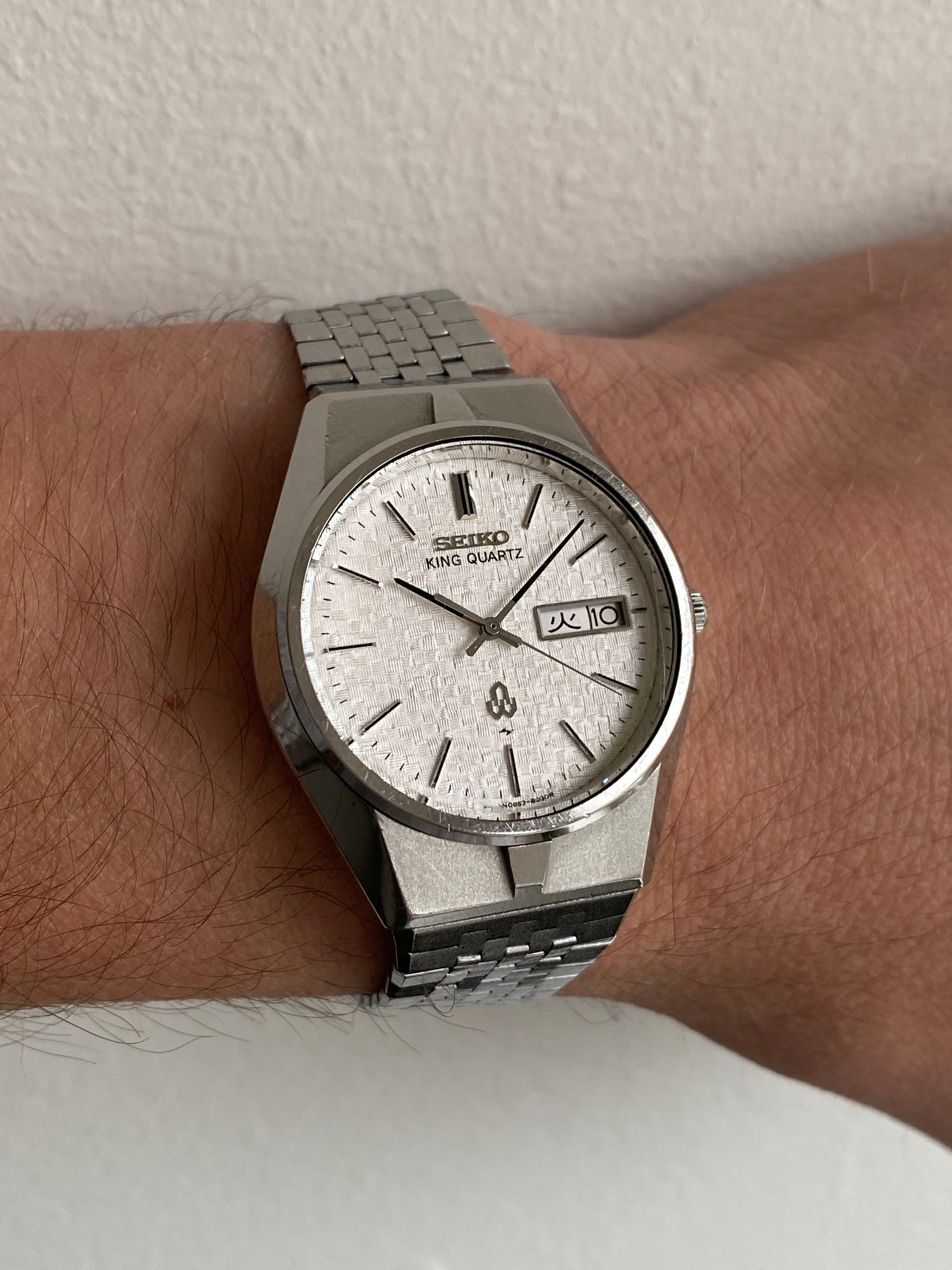 Seiko King Quartz from 1976 in excellent condition. It features a textured dial inspired by traditional Japanese tatami mats, one of the coolest dials when it comes to vintage Seiko.