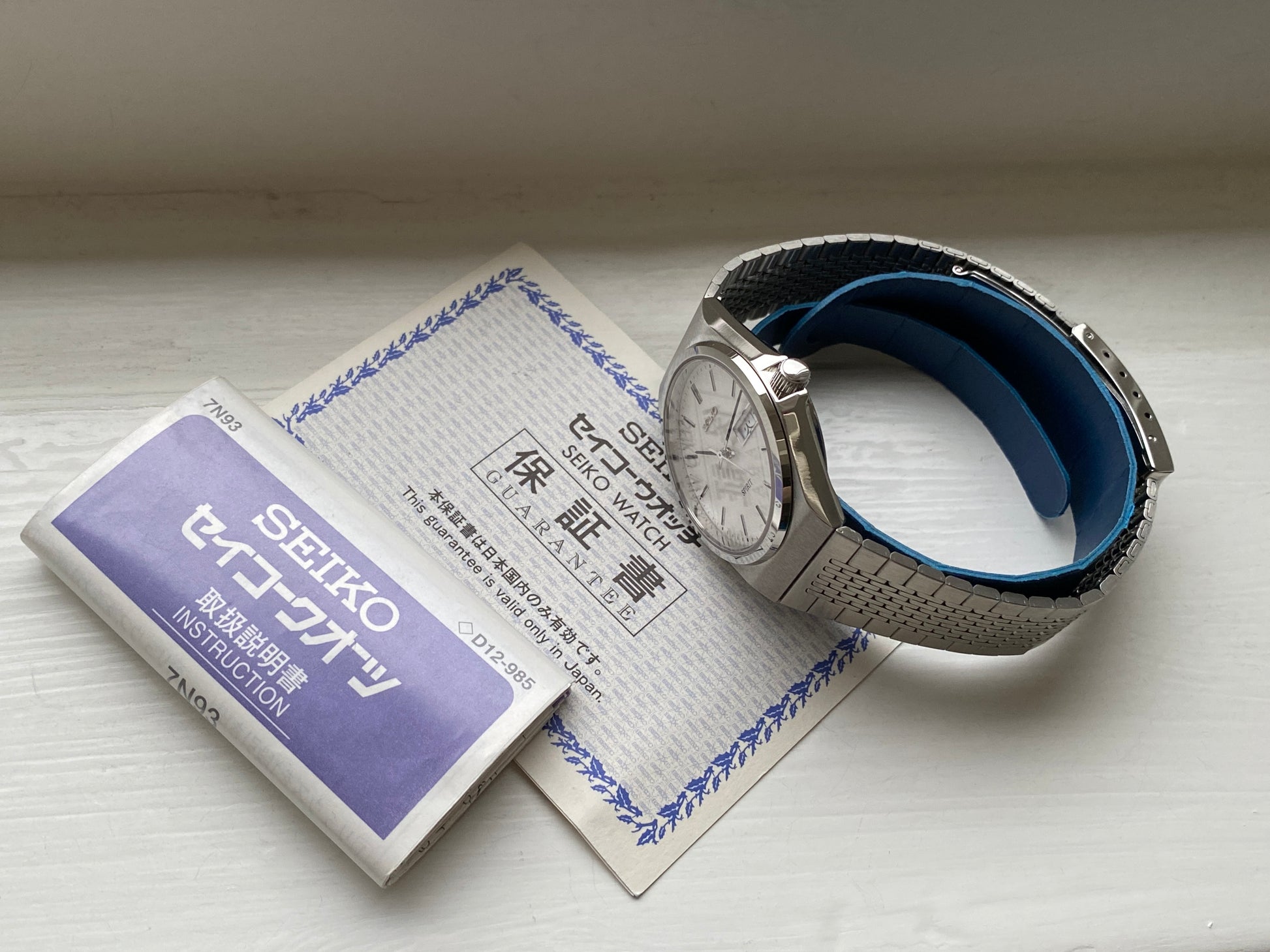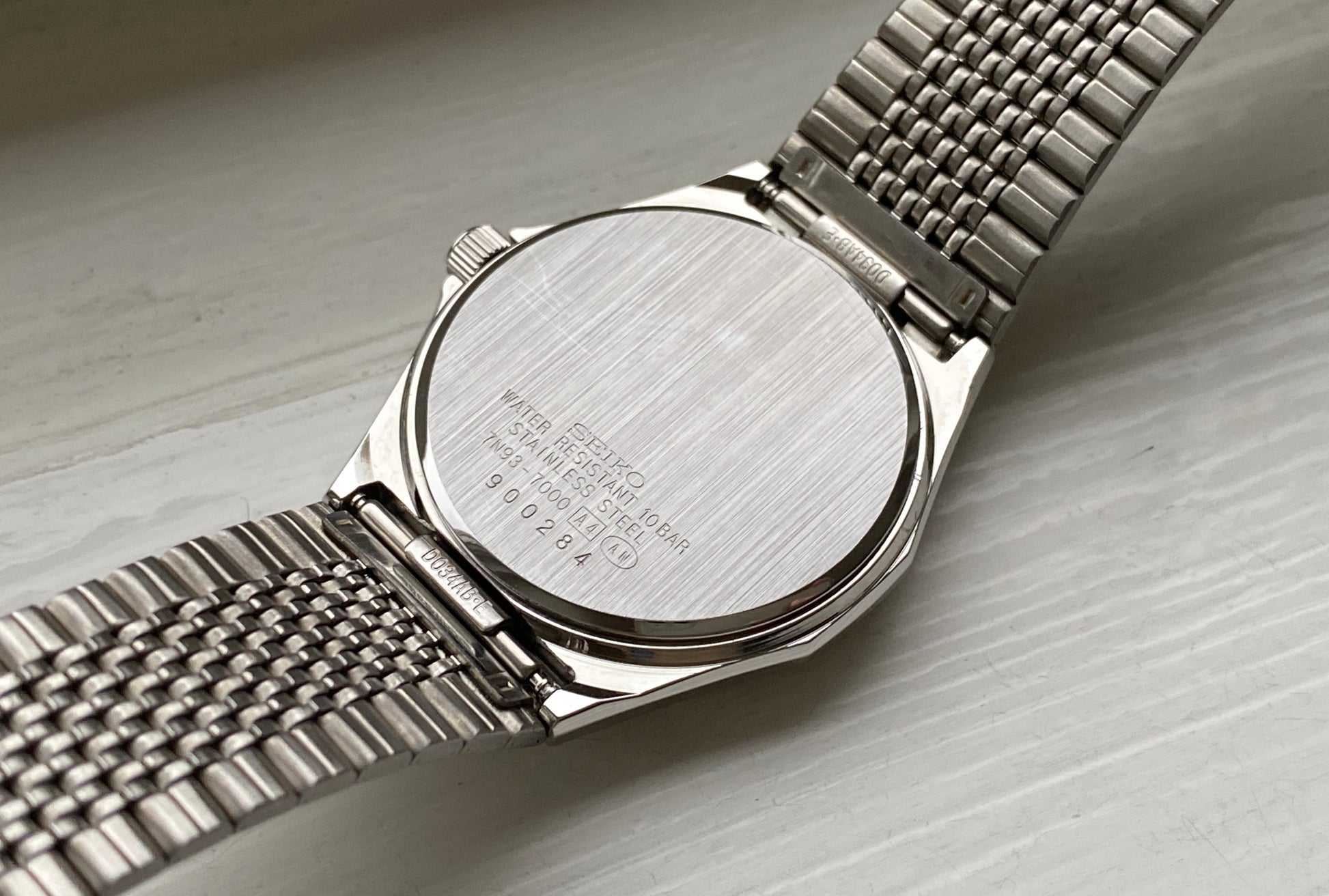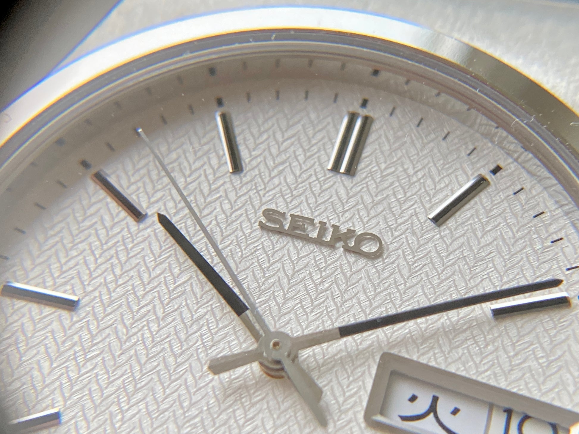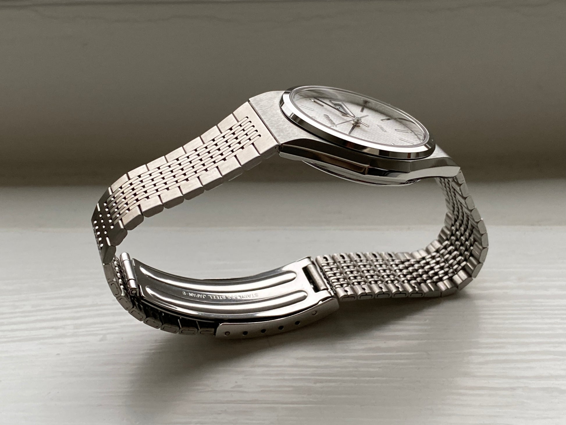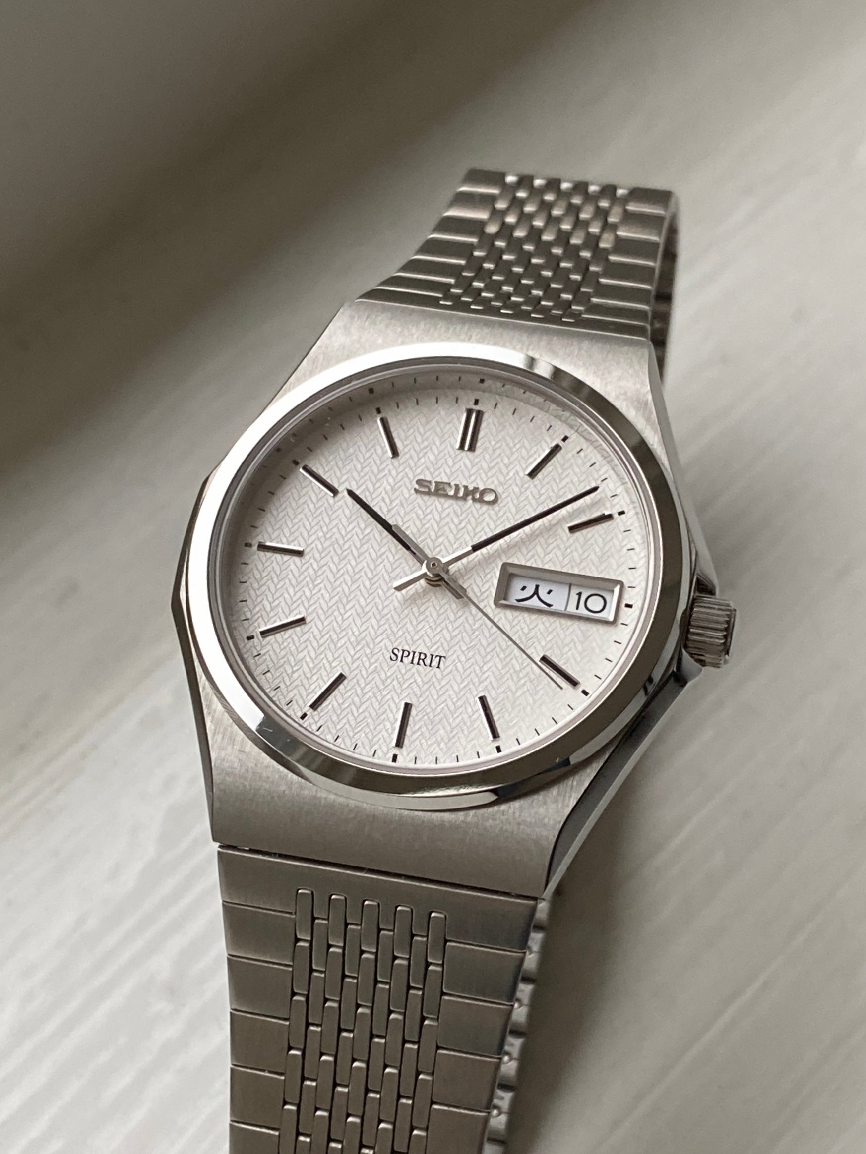 Simple and classy, this Seiko Spirit. Produced for the Japanese Domestic Market (JDM). It offers several interesting features, including a scratch-resistant sapphire, a screw-down crown and a high-quality quartz movement. The dial has a very subtle leaf pattern, and the day can be displayed in Japanese Kanji and English. It’s pretty thin, so it slides right under the cuff of your shirt.