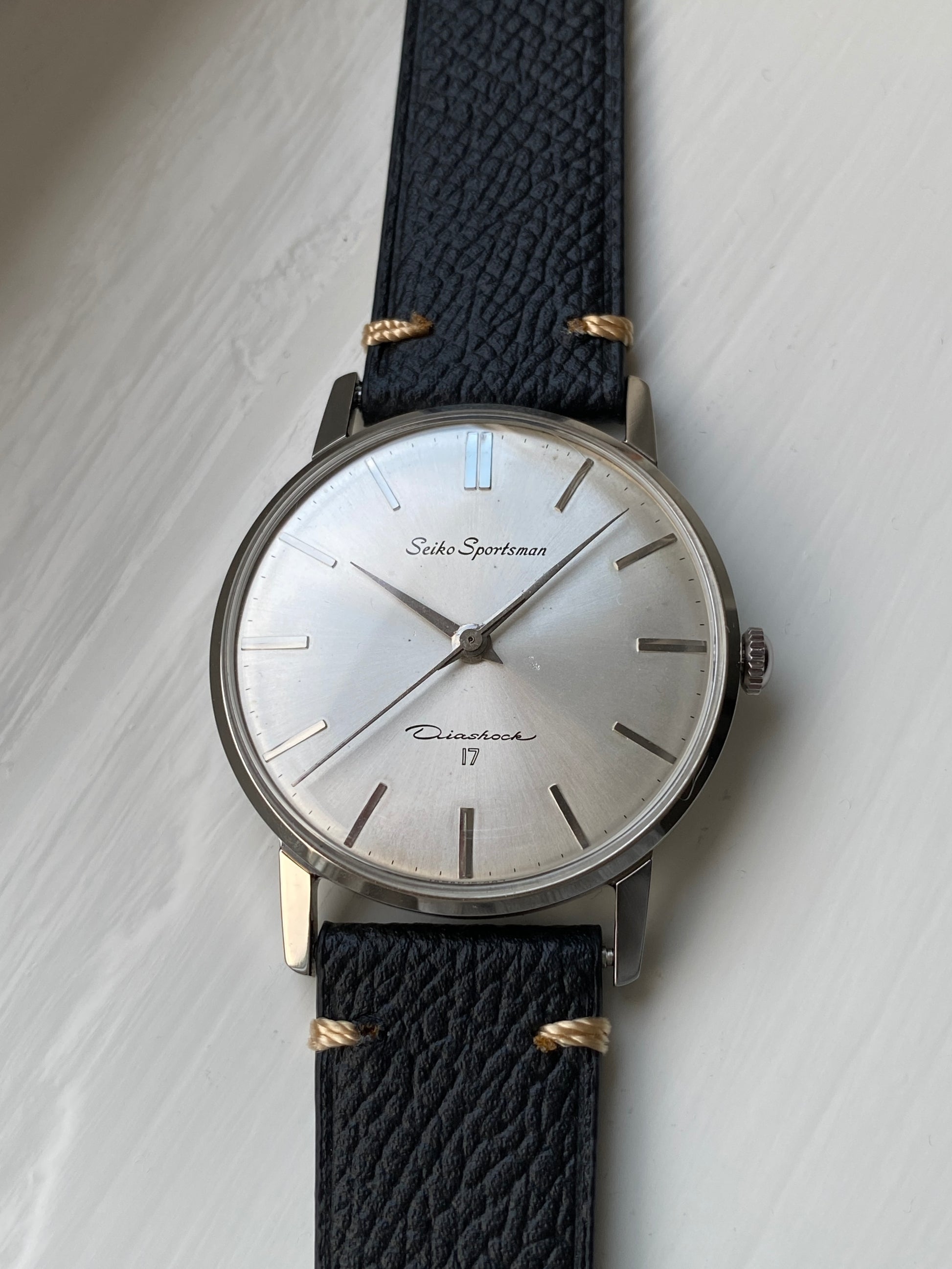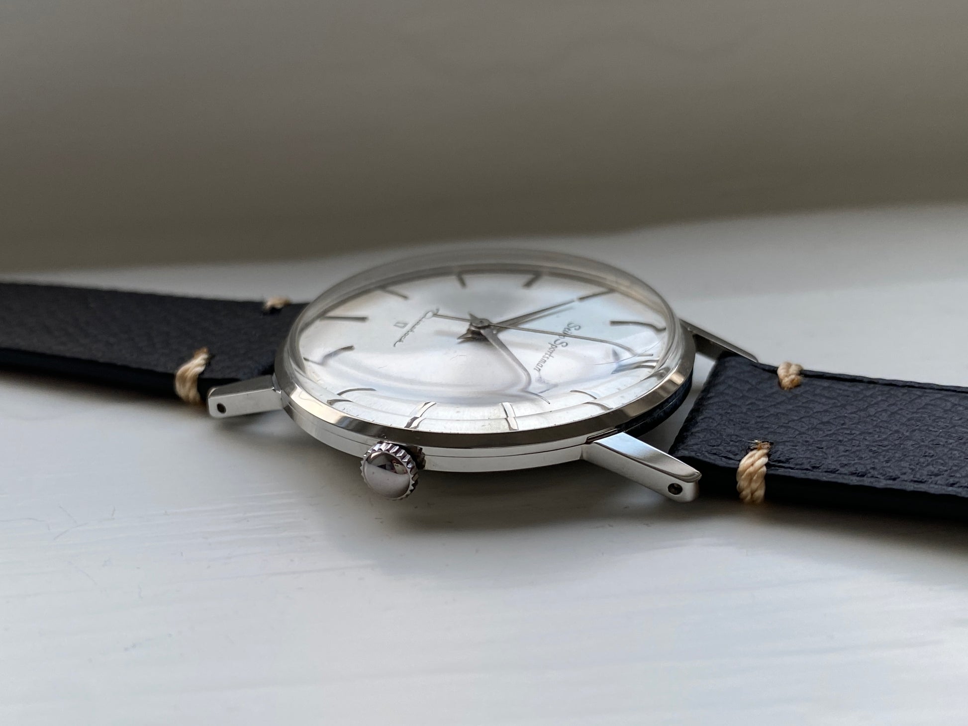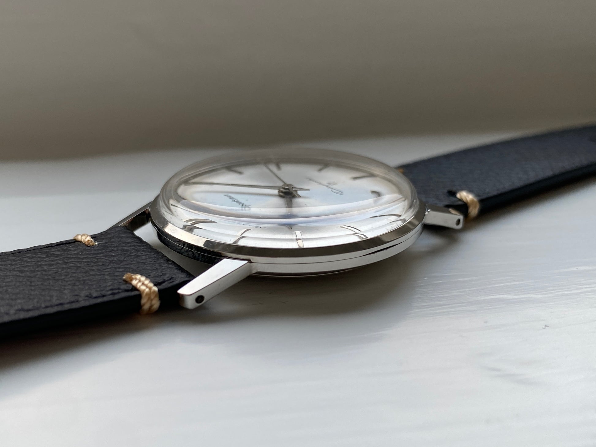 The dauphine hands and minimalistic dial with sunburst effect make for a classy hand-wound dress watch. The watch has been paired with a new leather strap. It has pretty thin profile, so it slides right under the cuff of your shirt.