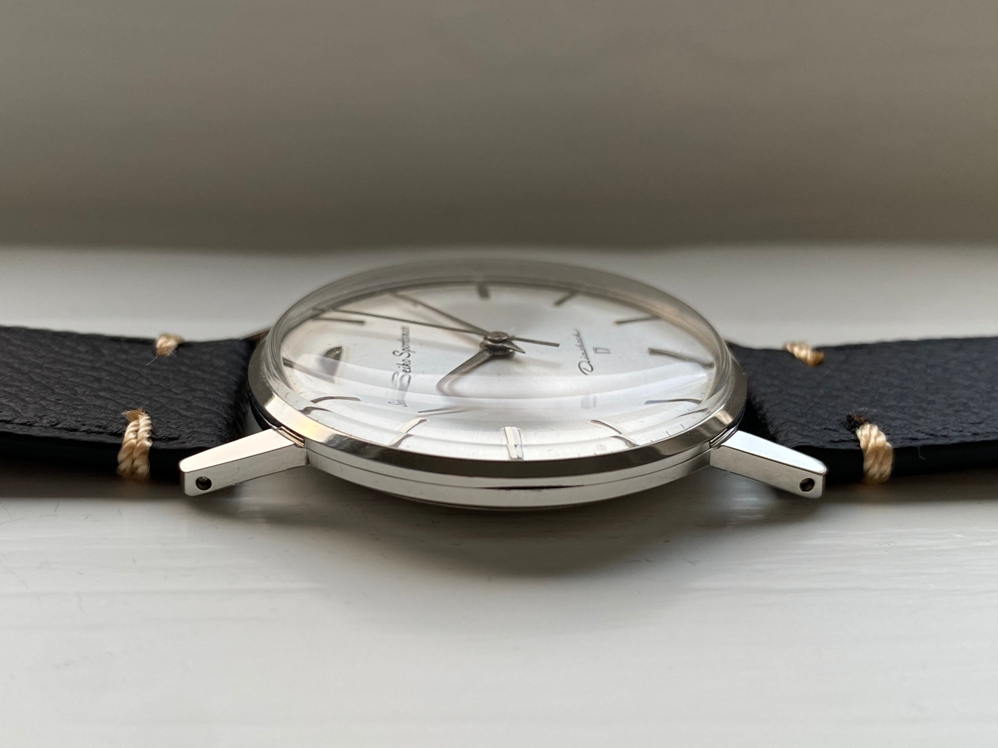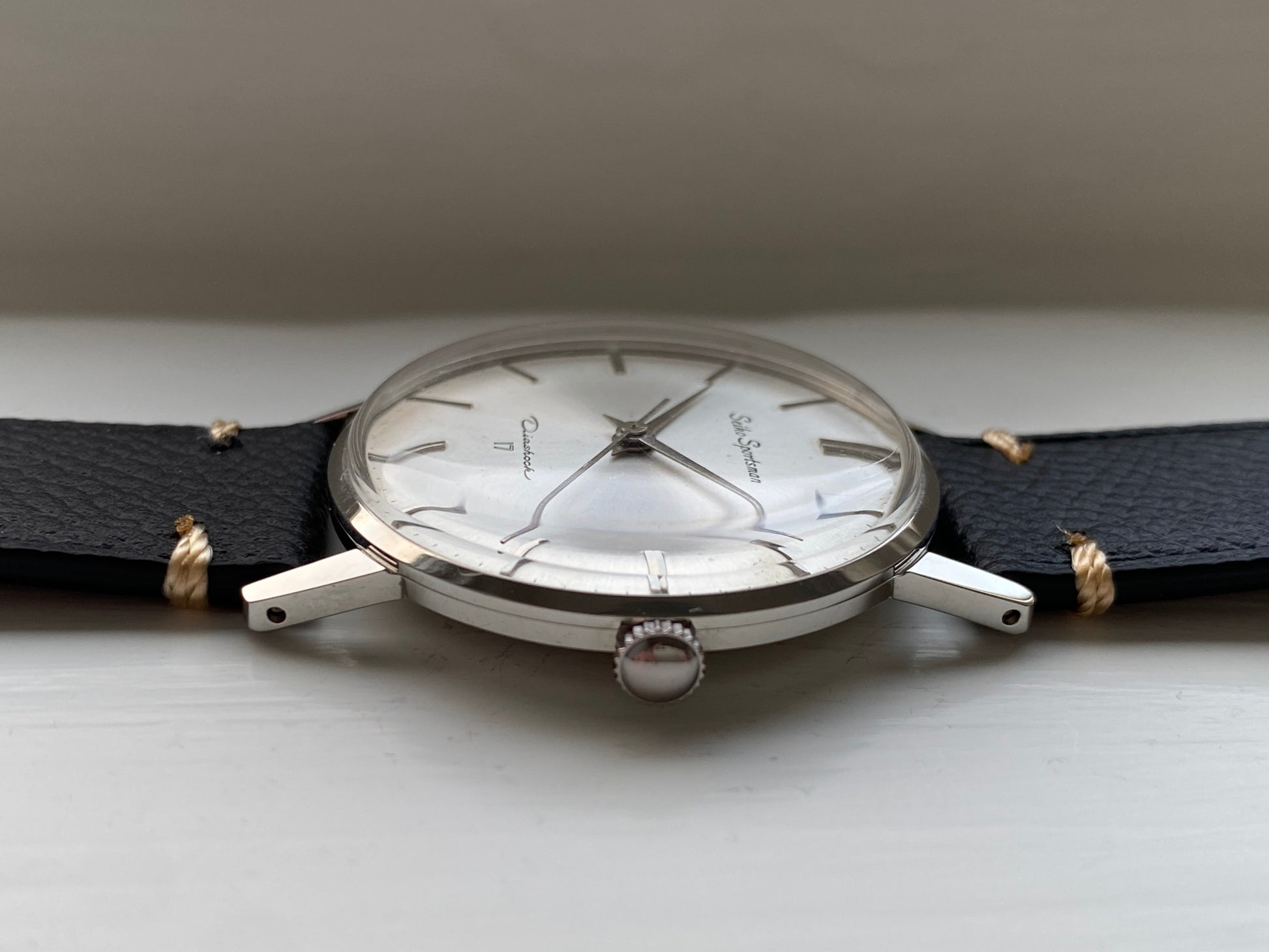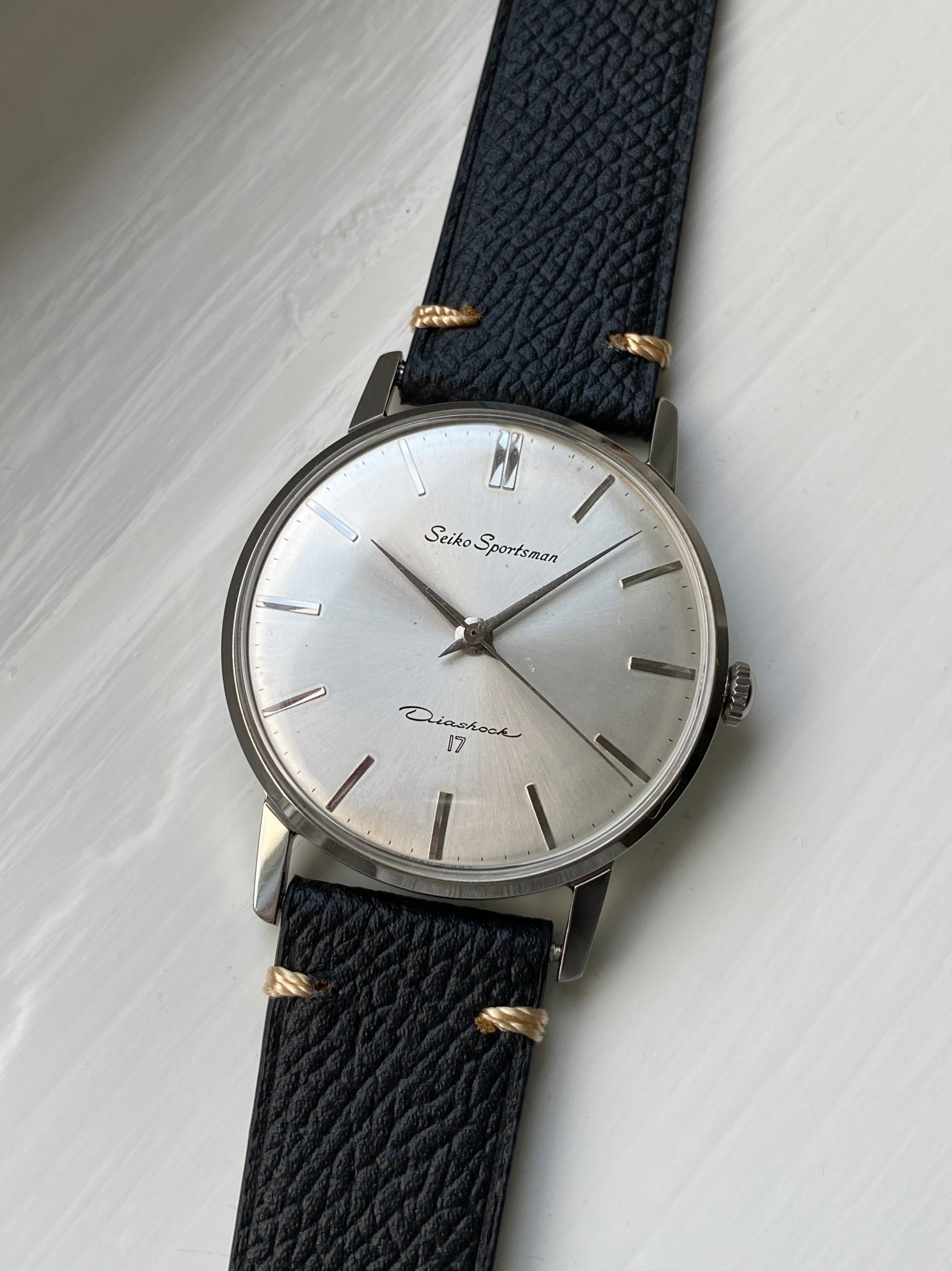 The dauphine hands and minimalistic dial with sunburst effect make for a classy hand-wound dress watch. The watch has been paired with a new leather strap. It has pretty thin profile, so it slides right under the cuff of your shirt.