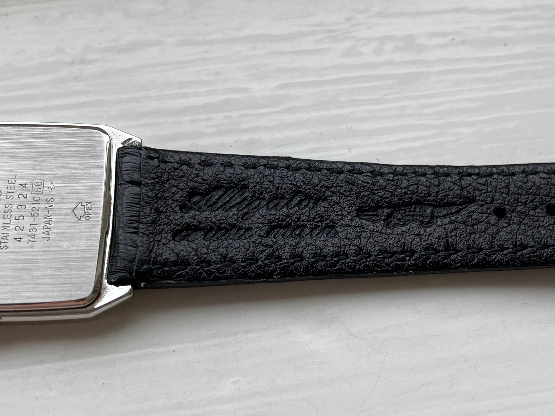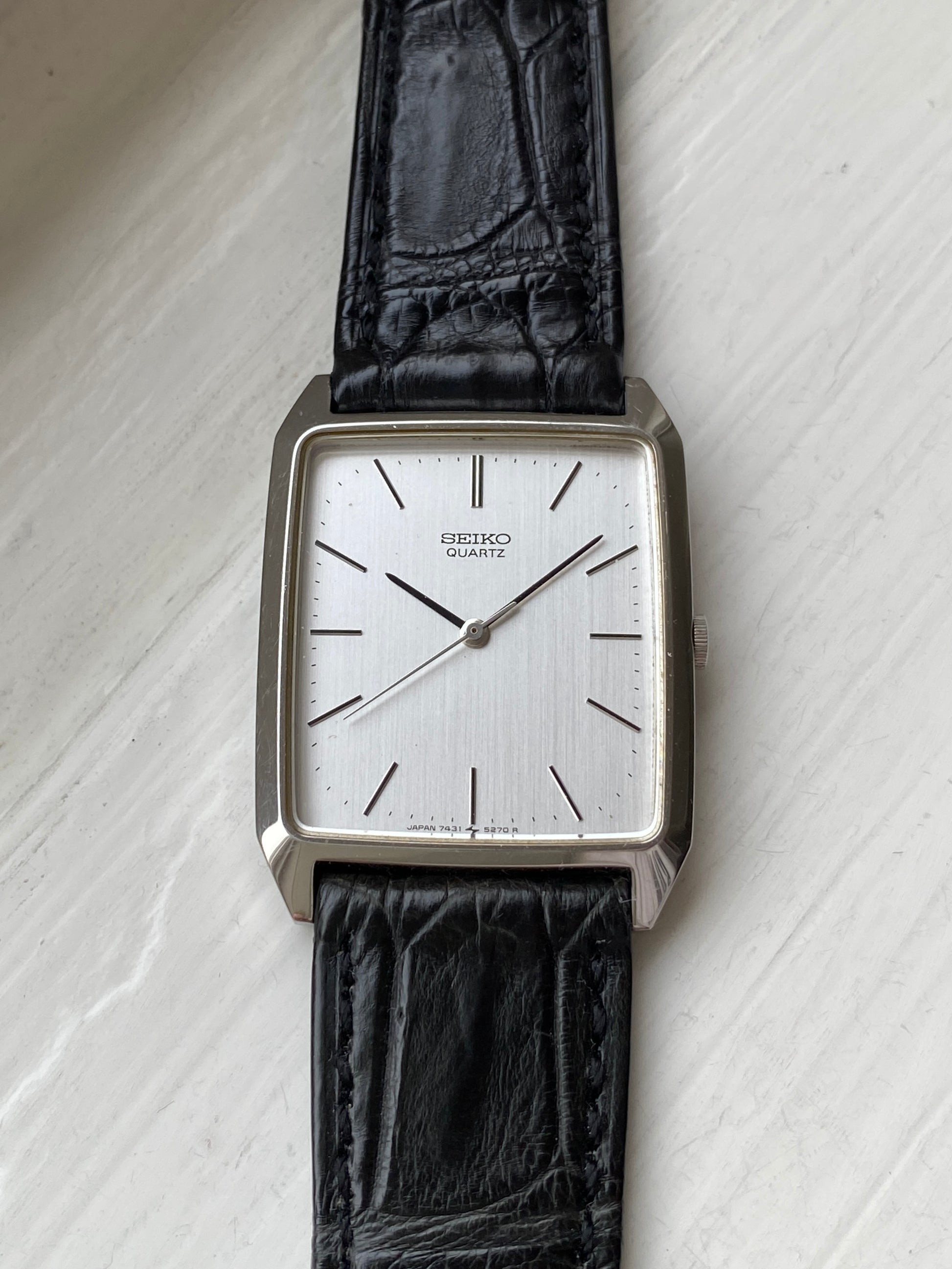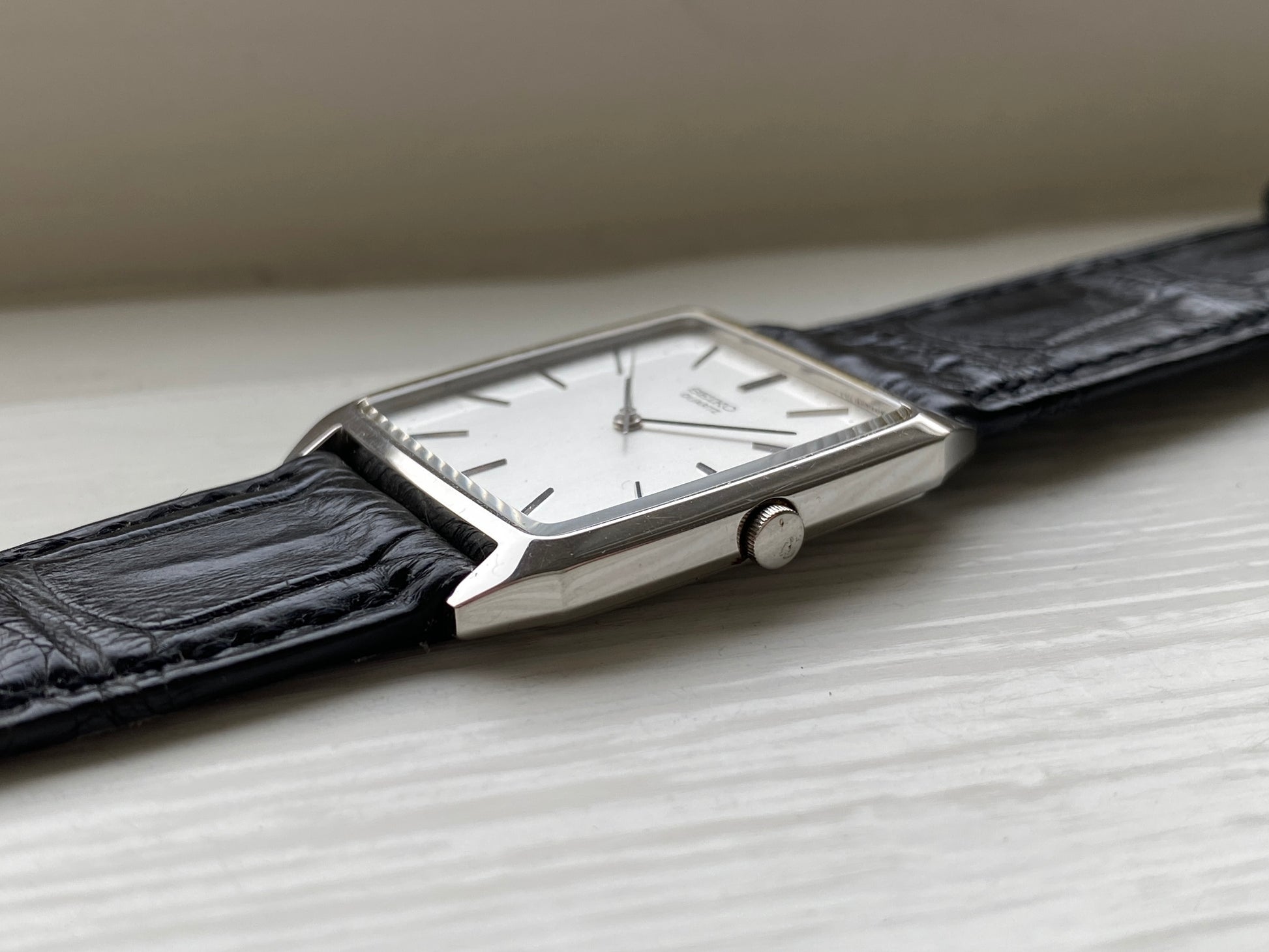 Seiko Quartz with a classic tank-style case, in mint condition. The dial has a subtle linen texture and shows a slight reflection, as visible in the wrist photos. It comes with a new alligator leather strap.