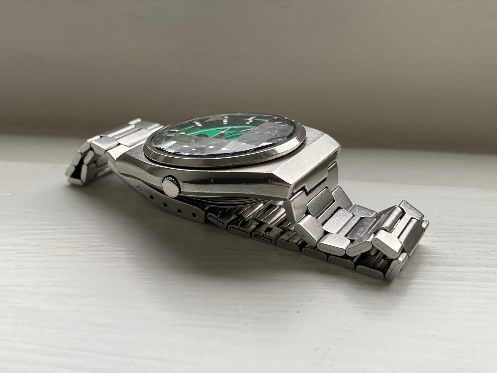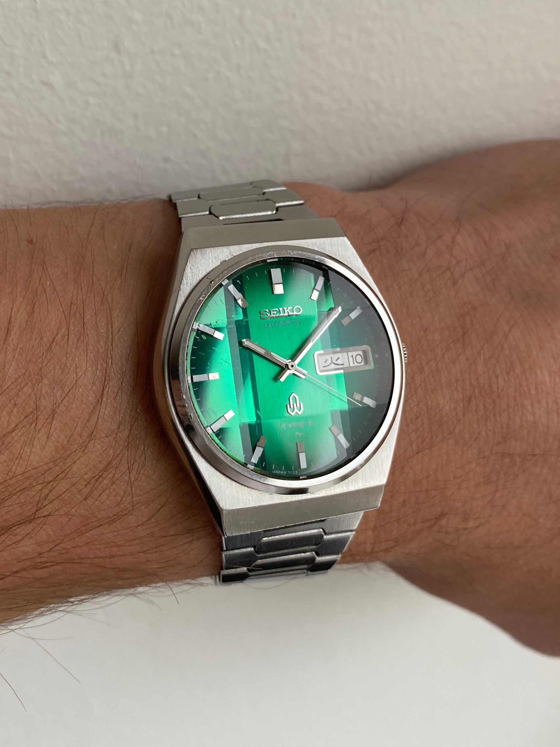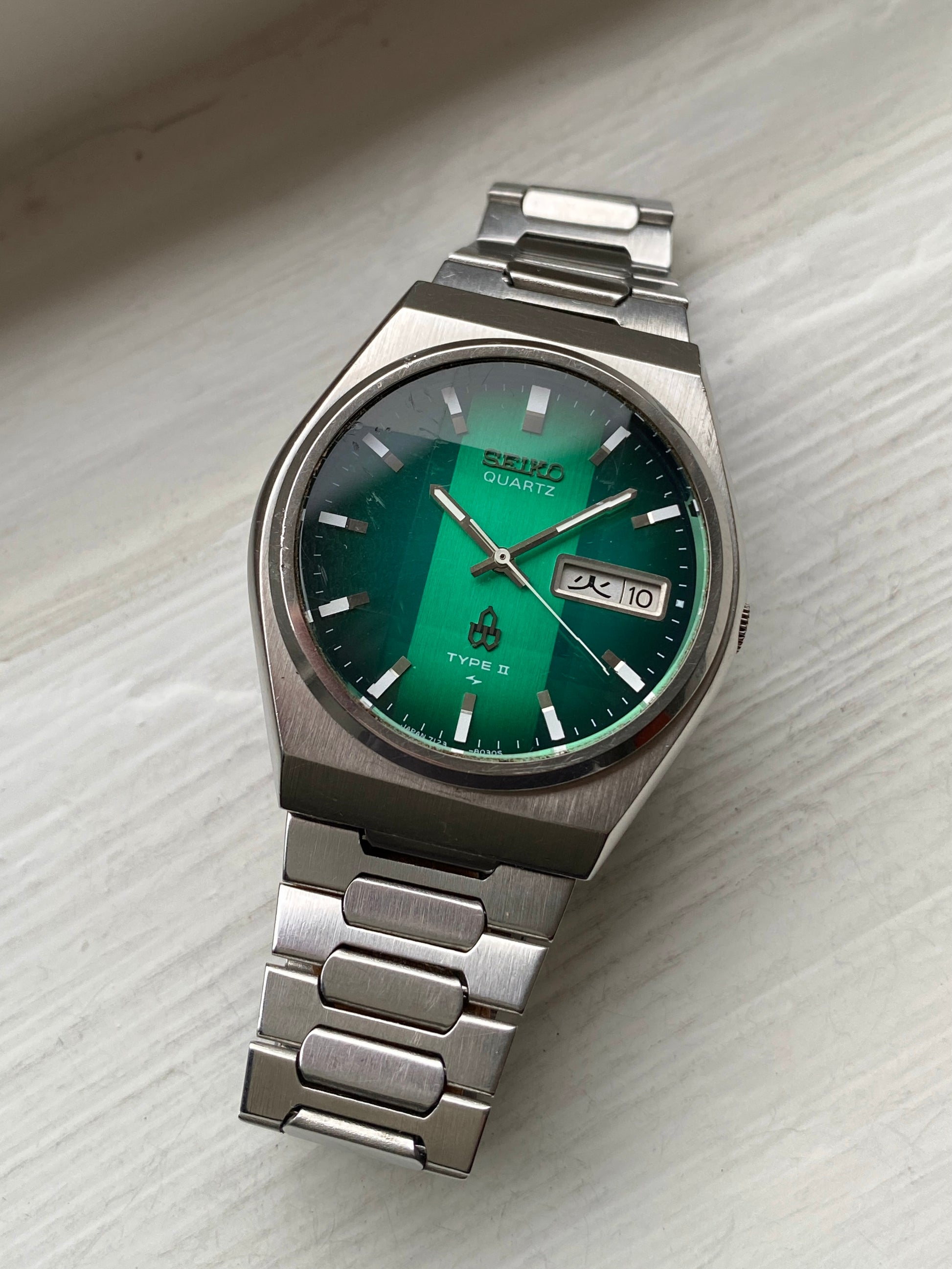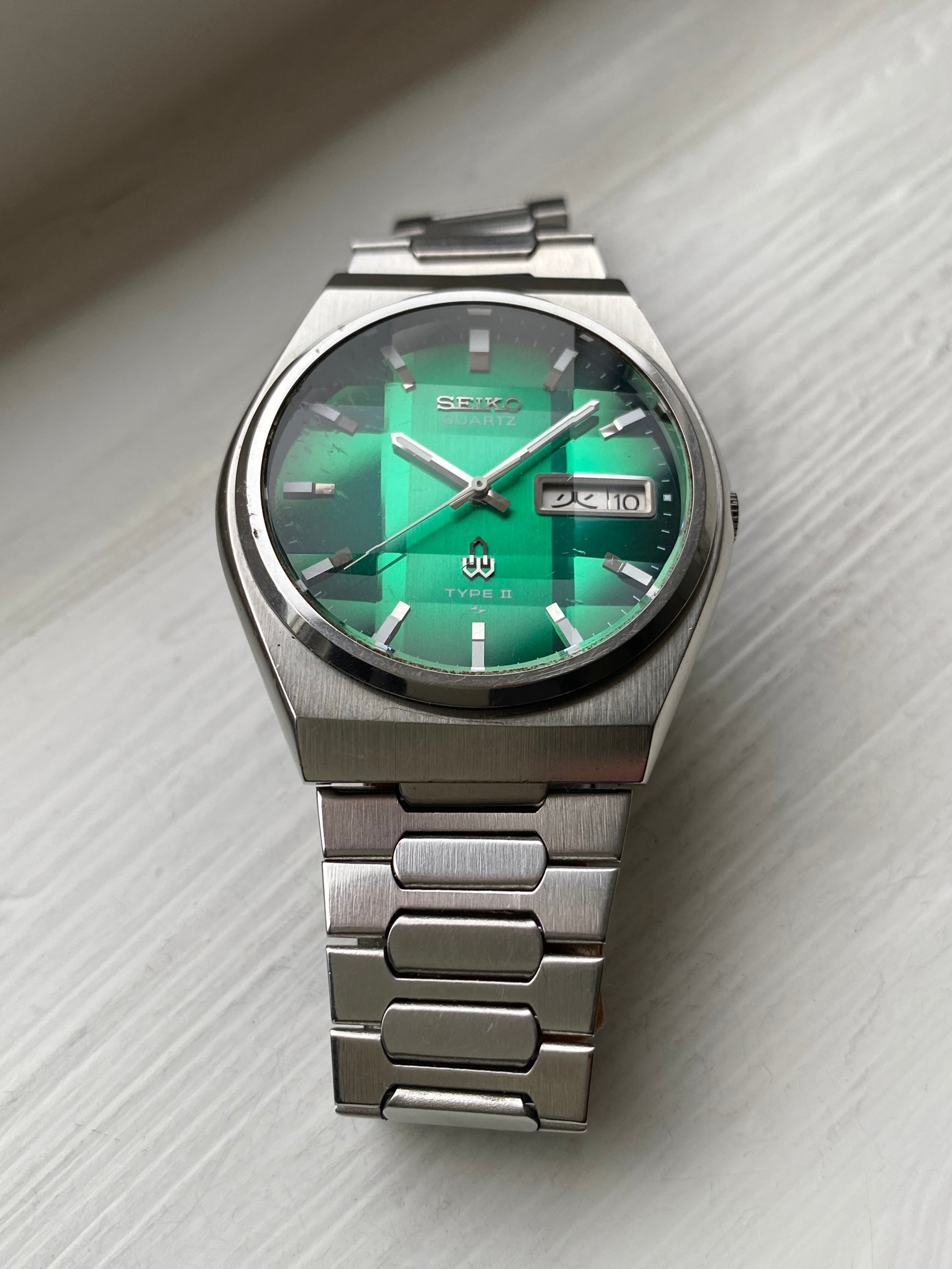 This Type II from 1978 features a stainless steel case with a simple yet comfortable bracelet and a striking bright green dial protected by a distinctive faceted crystal. The watch offers a day display in both Japanese Kanji and English.
