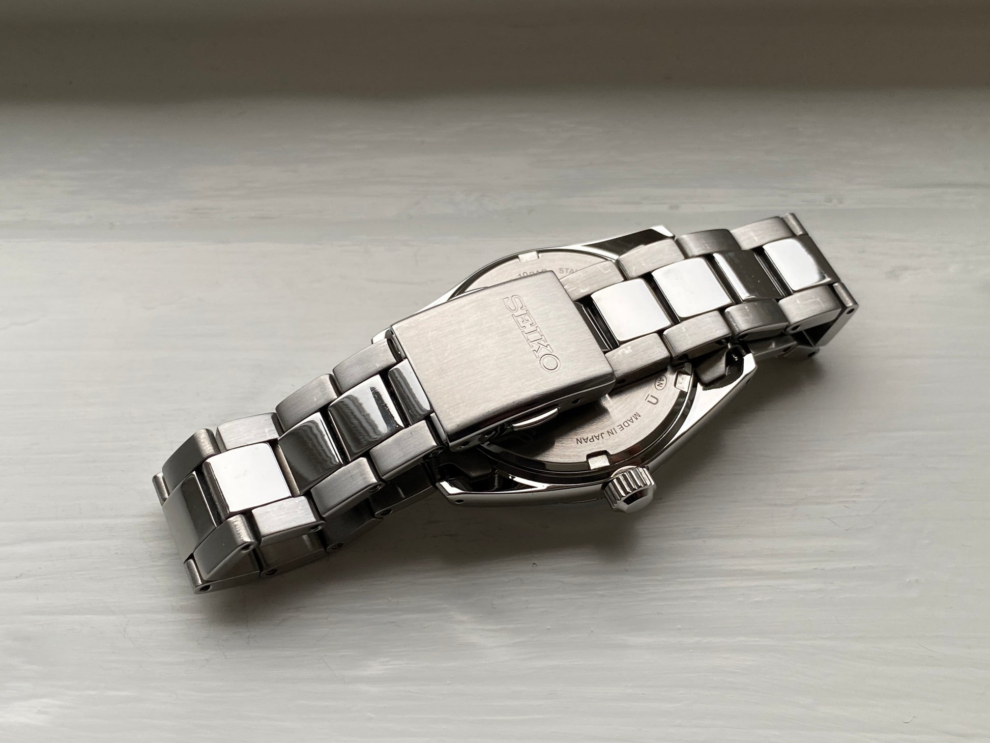 Inside you will find Seiko's 7N42 quartz movement. This calibre operates at a frequency of 32,768 vibrations per hour and is powered by a SR920SW battery, offering precise timekeeping with minimal deviation. It includes a date display at the three o'clock position, sweep seconds hand, and in some variants, a single jewel for enhanced durability. The 7N42 is known as a straightforward, dependable quartz mechanism built for everyday reliability and low maintenance.